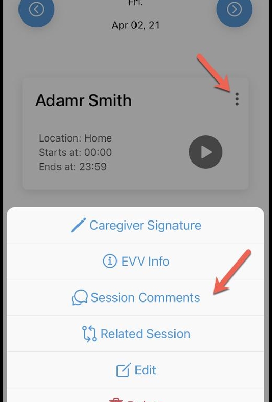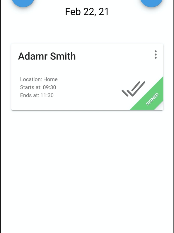 22. At this point, you are ready to collect the Caregiver's signature by clicking on the three dots icon in the right upper corner of the event card, and then click on the Caregiver Signature option: