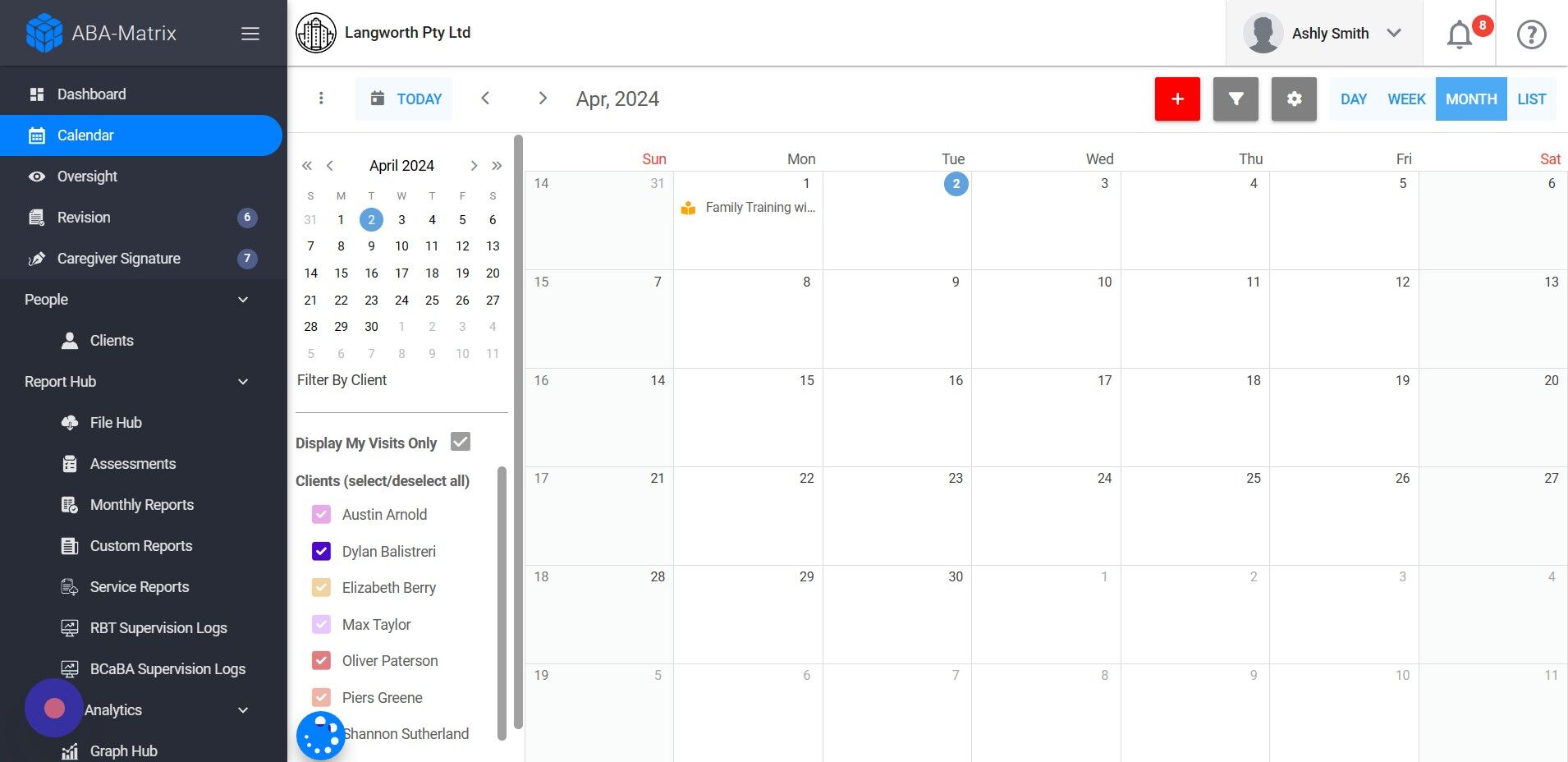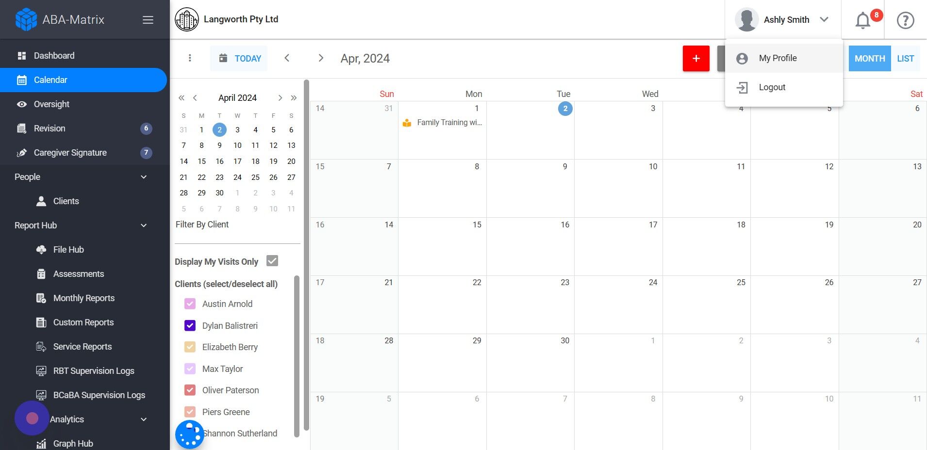 2. Upon entering the program, you will be taken straight to the calendar. Navigate to the upper right corner of the screen, where you will find an option labeled with your username, as illustrated in the picture.
