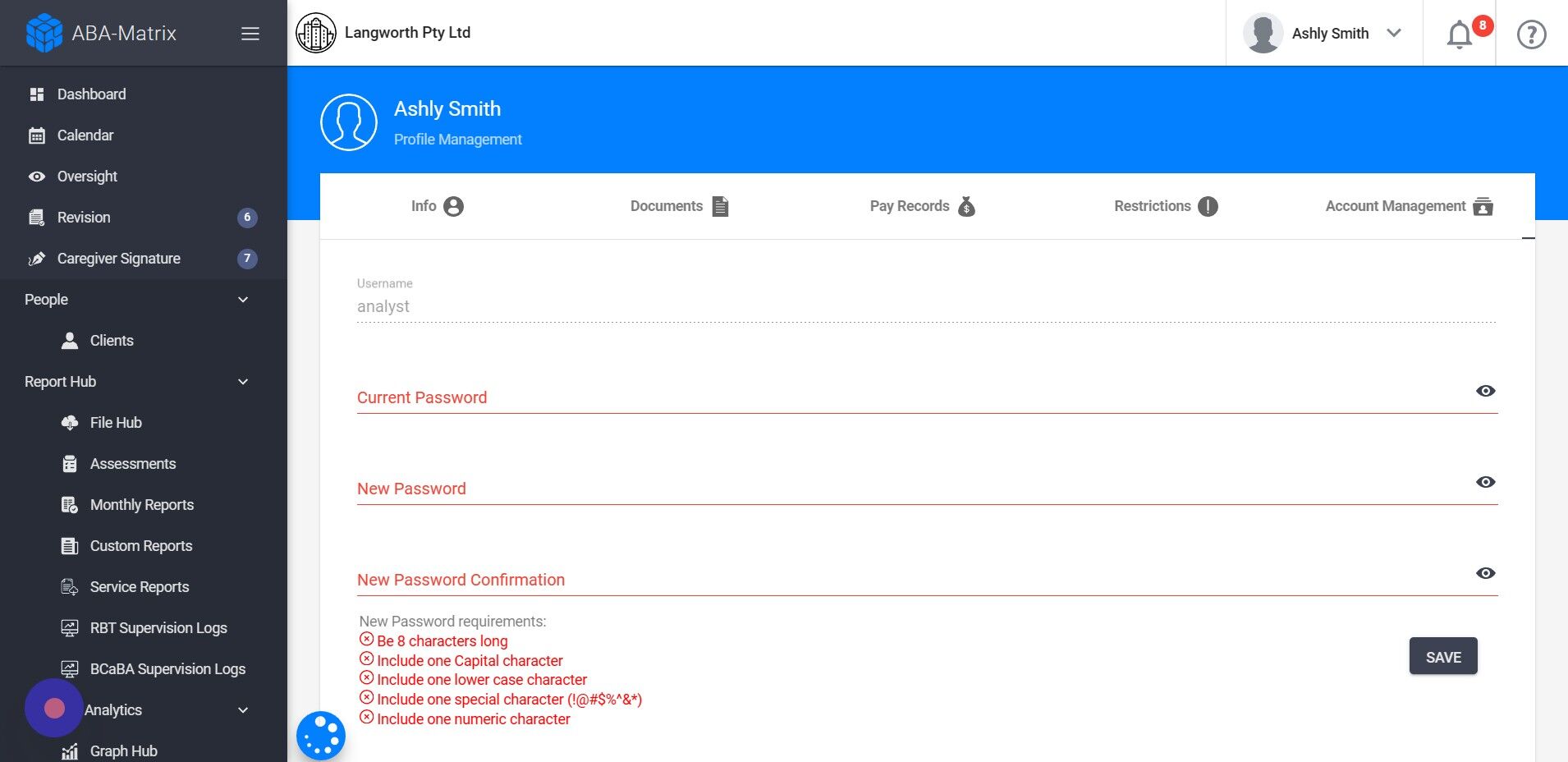 1. To change the password properly, first log in to the program with your current credentials. Once you enter the program, the calendar will go directly. Go to the top right of the screen where you can see an option identified with your username. Navigate tohttps://app.abamatrix.com/authentication/login