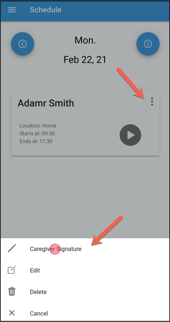 22. En este punto, está listo para recolectar la firma del cuidador haciendo clic en el ícono de tres puntos en la esquina superior derecha de la tarjeta del evento y luego haga clic en la opción Caregiver Signature: