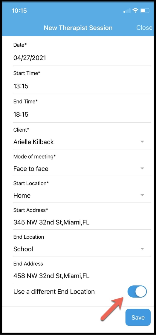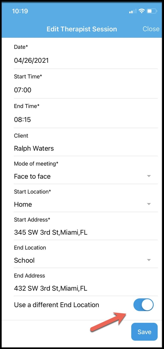 12. Una vez que comience la visita, accederá a la página de Sesión. Observe en esta página el mapa de ubicación que mostrará su ubicación actual en rojo, la ubicación programada en azul y la radio circular de 0,5 millas que muestra la distancia aceptable desde el rango programado.