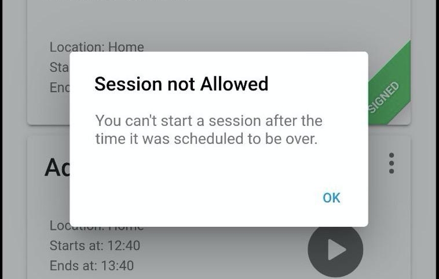 - No podrá iniciar visitas antes de la fecha de la sesión programada. Es decir, no se pueden iniciar sesiones programadas para fechas futuras.