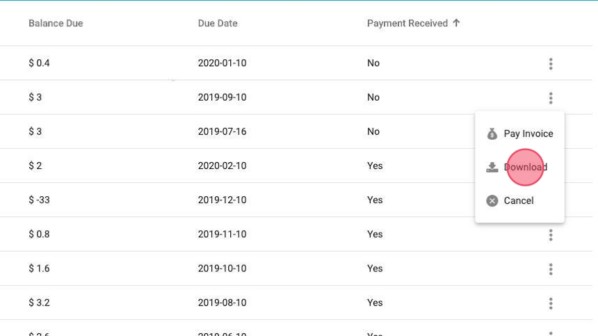 3. En la lista de Invoices, selecciona la factura que deseas pagar y haz clic en el botón de tres puntos.