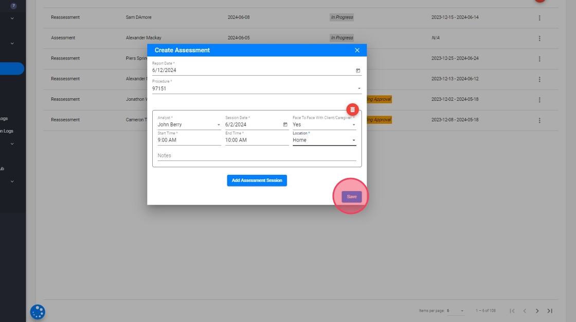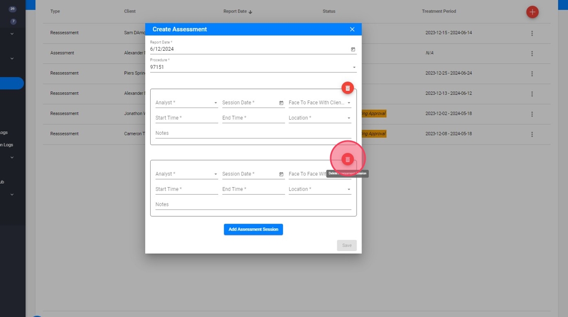 - Session date: Debe programarse dentro del período de aprobación del cliente para Assessment (97151)