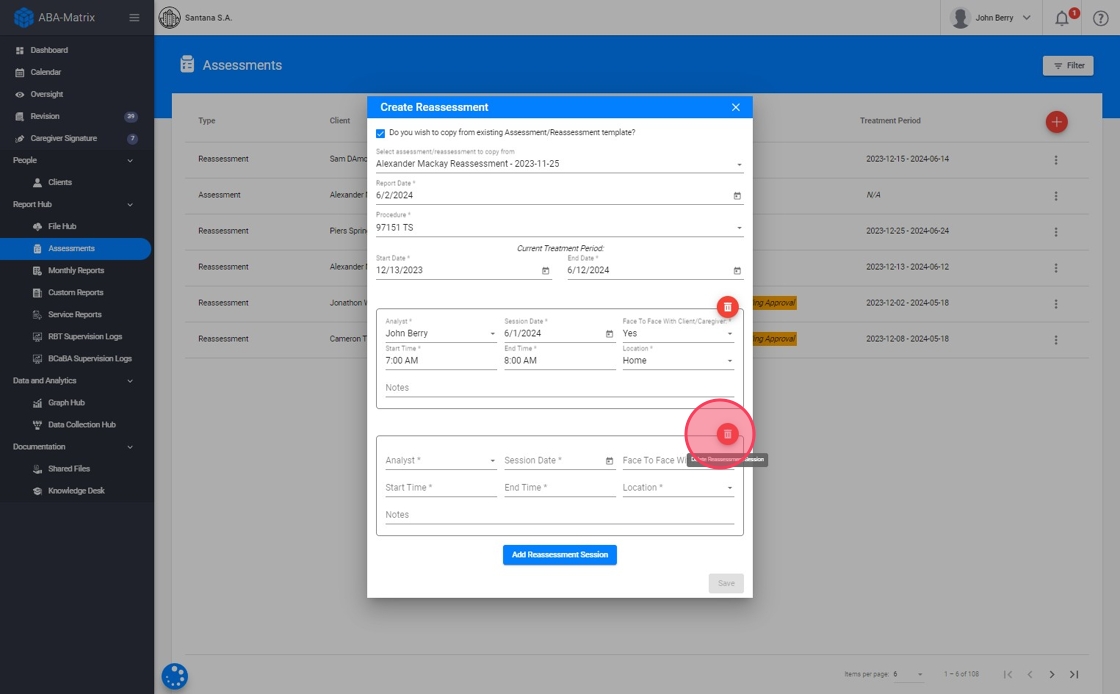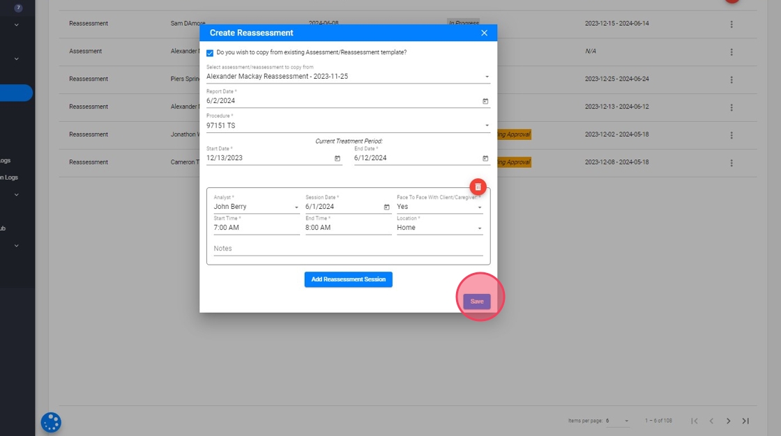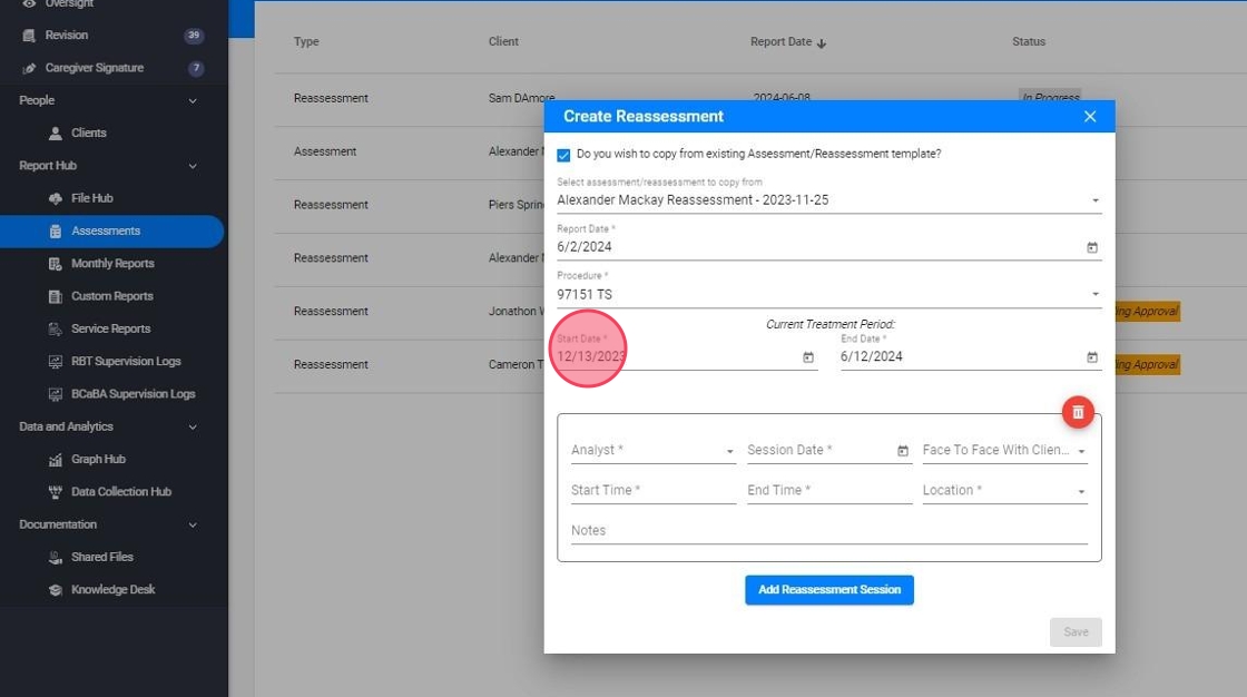- Session date: debe programarse dentro del período de aprobación del cliente para el Reassessment (97151 TS)