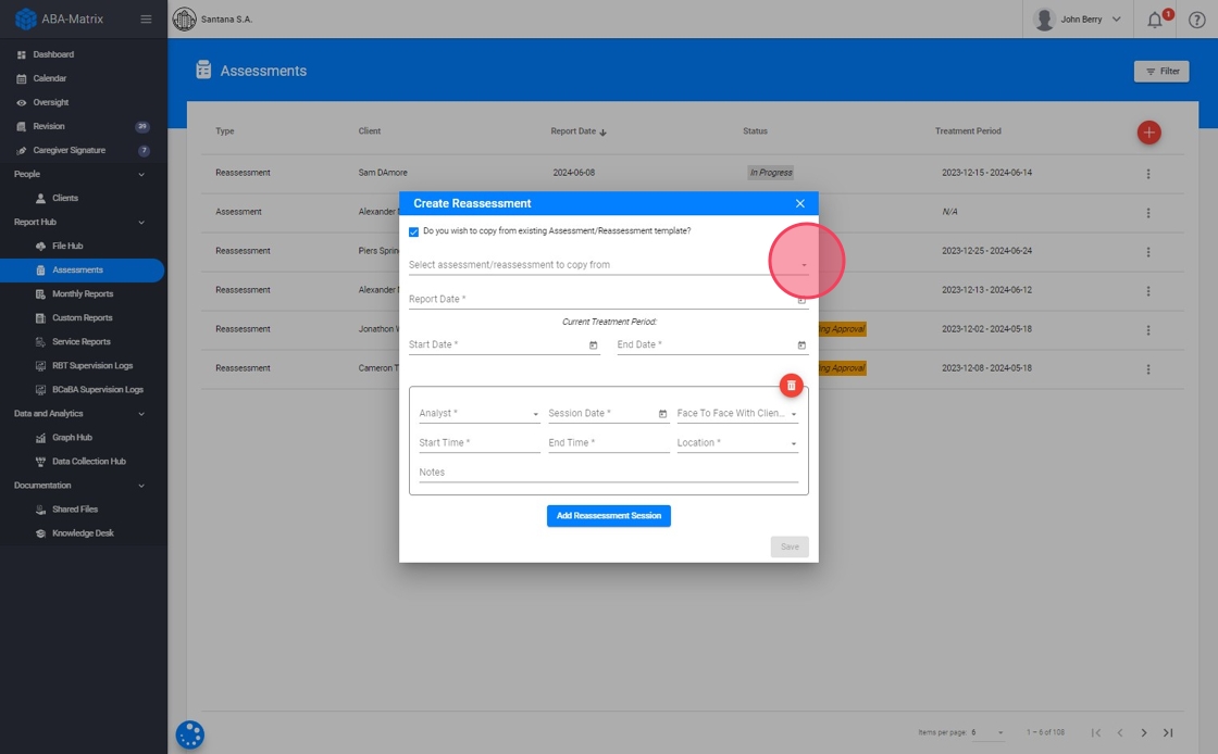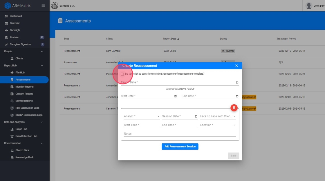Esta guía proporciona instrucciones paso a paso sobre cómo agregar una reevaluación desde la sección de Assessments. Explica cómo seleccionar un cliente, copiar desde una plantilla existente, establecer la fecha del informe y el período de tratamiento, agregar observaciones y guardar la reevaluación.