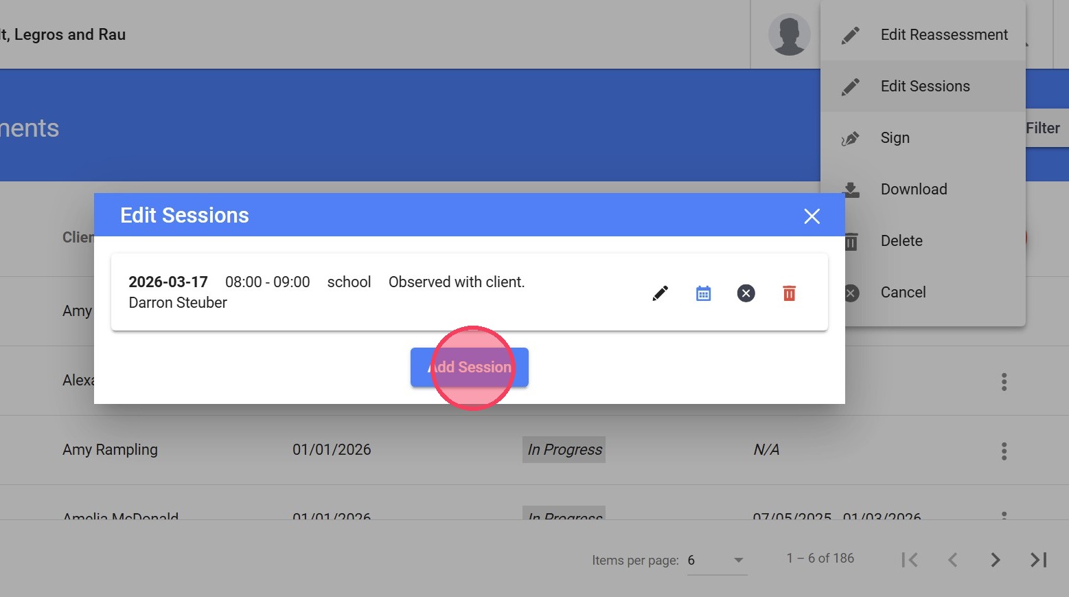 11. In the displayed modal, you will see all sessions associated with that assessment or reassessment. From there, you can Add new sessions.