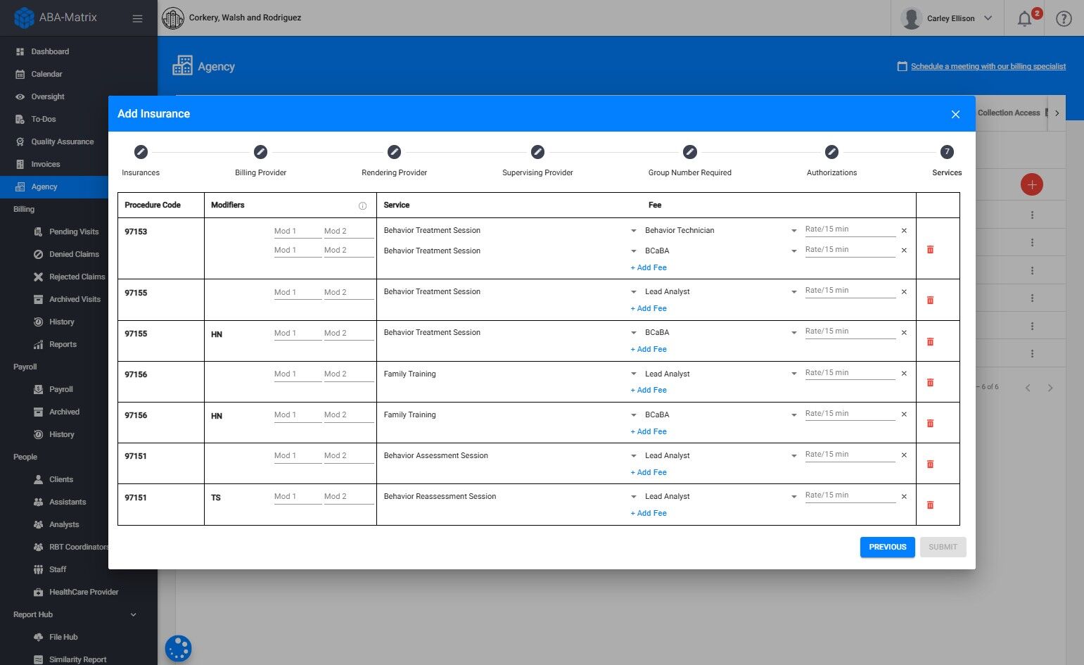 Para cada servicio vinculado a un código de procedimiento, debe ingresar la tarifa por cada intervalo de 15 minutos. Esto es fundamental para una facturación precisa y asegura que las tarifas estén alineadas con los contratos y acuerdos de su agencia con los pagadores.