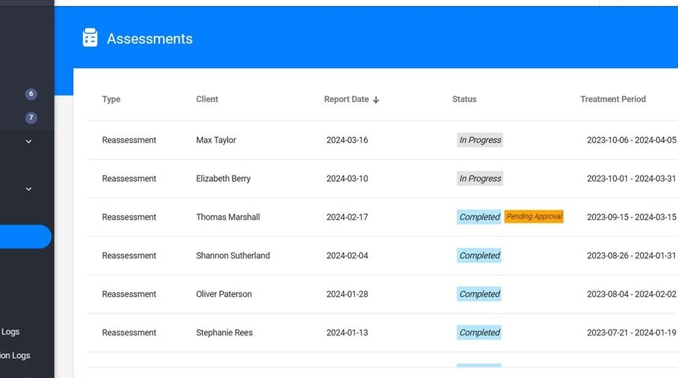 In the program there are different statuses for the Assessments/ Reassessments, to identify the sessions and their reports. The Assessments/Reassessments Session can be created directly observed with the client, or not.