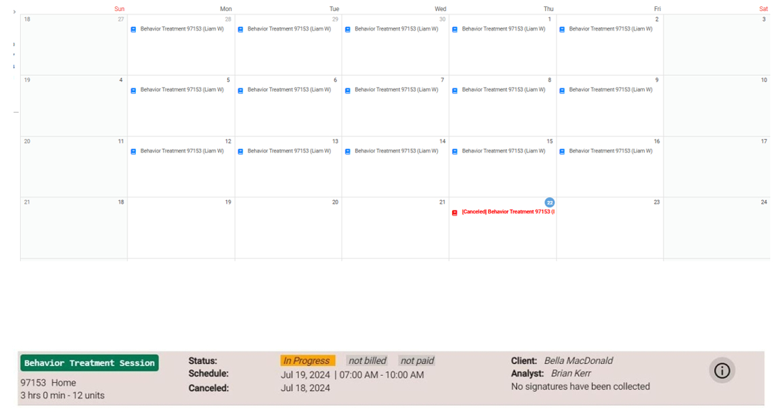 5. A session will be"Incomplete" if it was submitted without the caregiver signature. In this status, therapists won't have access to edit the event, and it will remain so until the caregiver signature is collected.