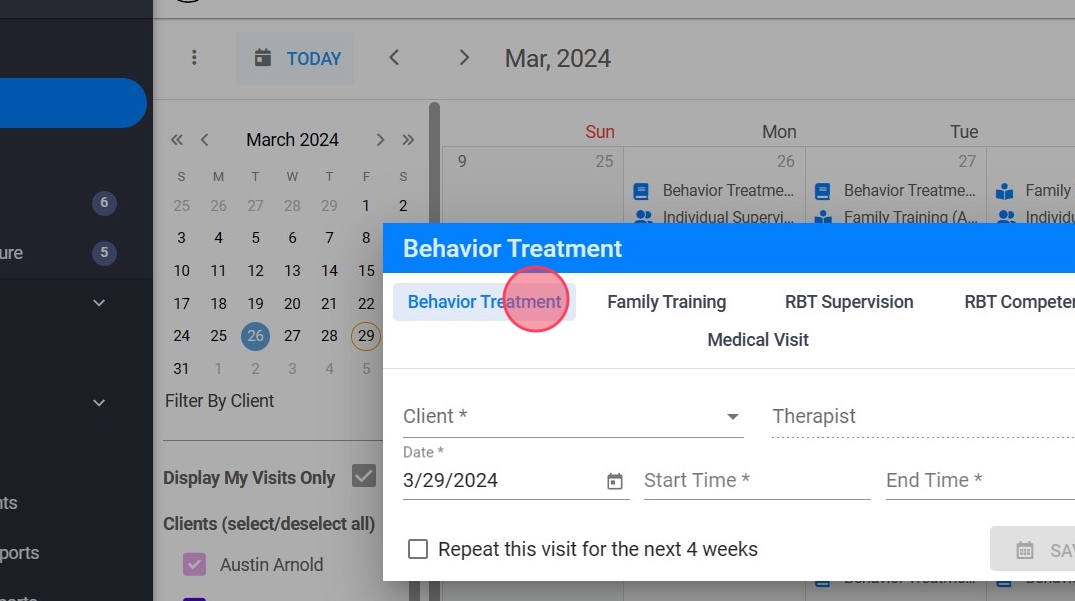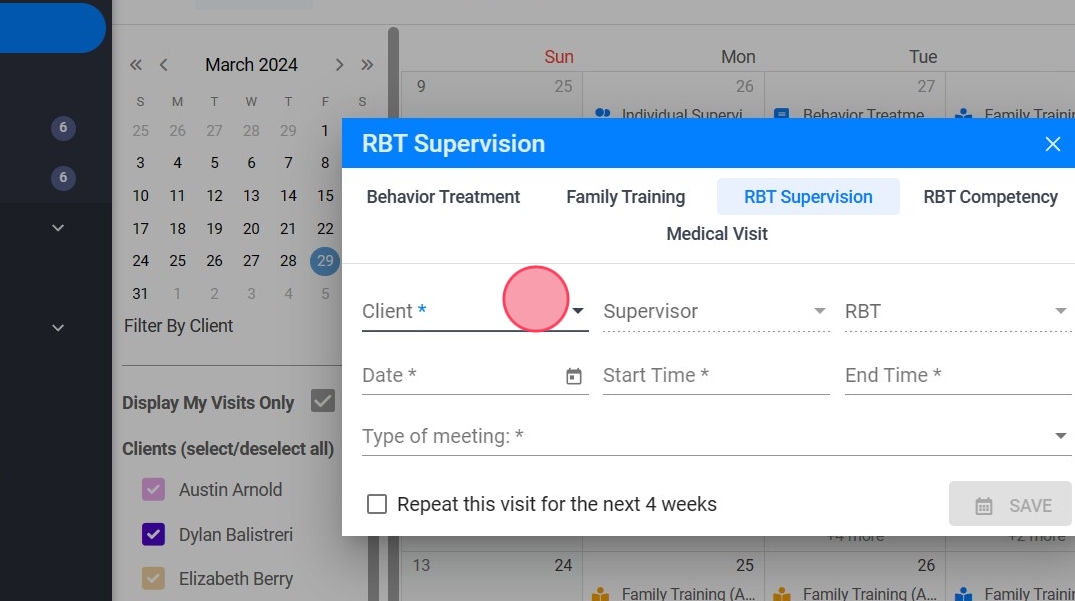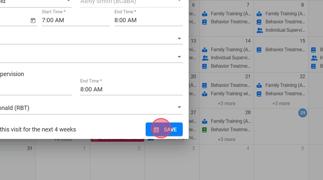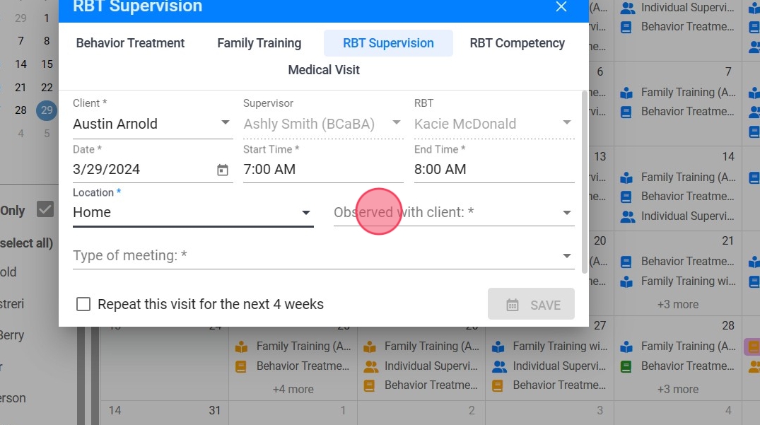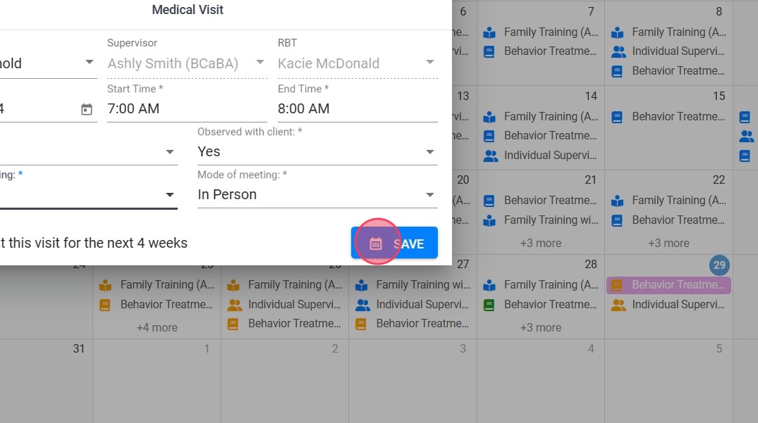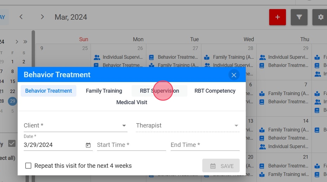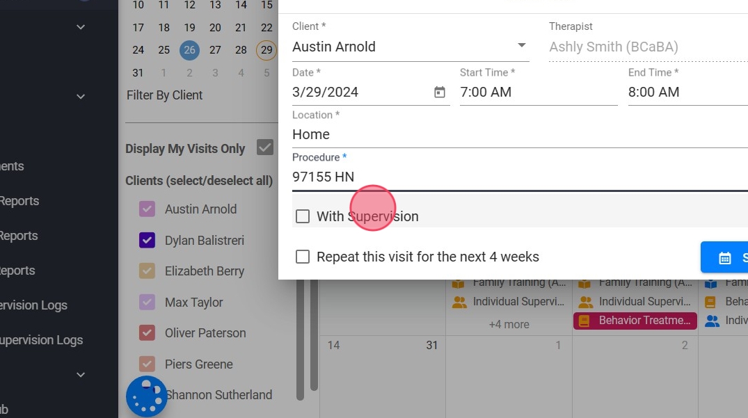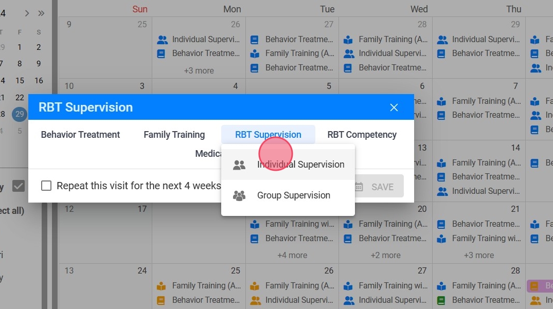 1. Creating supervision associated with a Behavior Treatment Session from the calendar