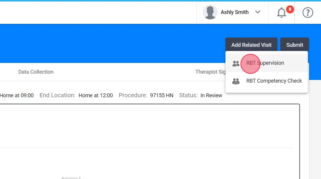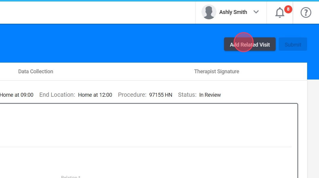 16. In the notes section of a Behavioral Treatment Session, click on the "Add Related Visit" option.