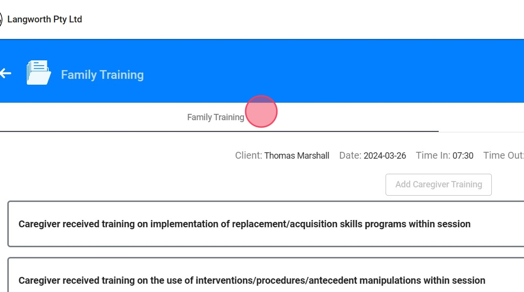 Esta guía proporciona instrucciones paso a paso sobre cómo agregar y completar una evaluación del caregiver en el programa. Explica cómo navegar a la sección correspondiente, crear o localizar una sesión de Family Training, agregar y completar la evaluación y firmar la sesión.