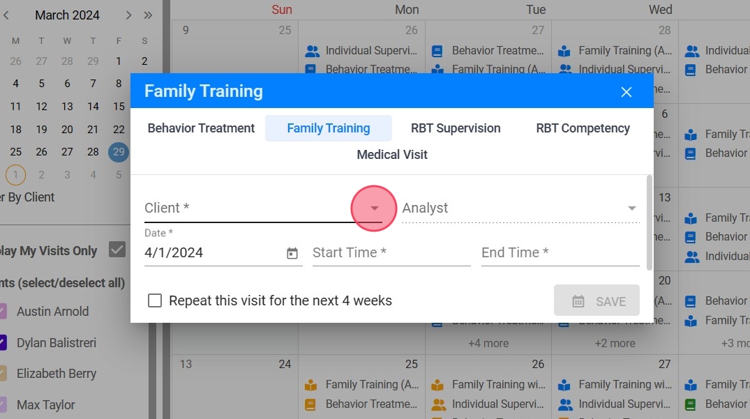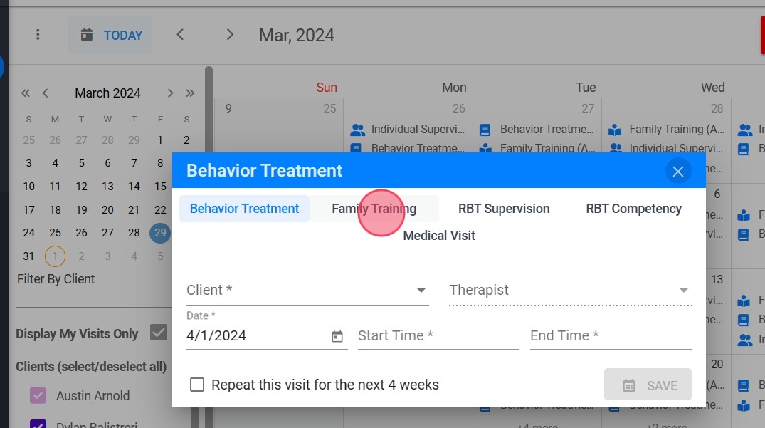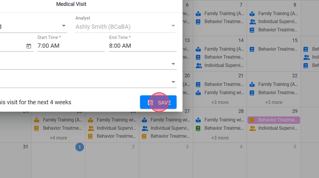 7. En el calendario, podrá distinguir rápidamente las sesiones de entrenamiento familiar que incluyen un Caregiver Competency Check de aquellas que no lo tienen programado, ya que se indica en el título del evento.