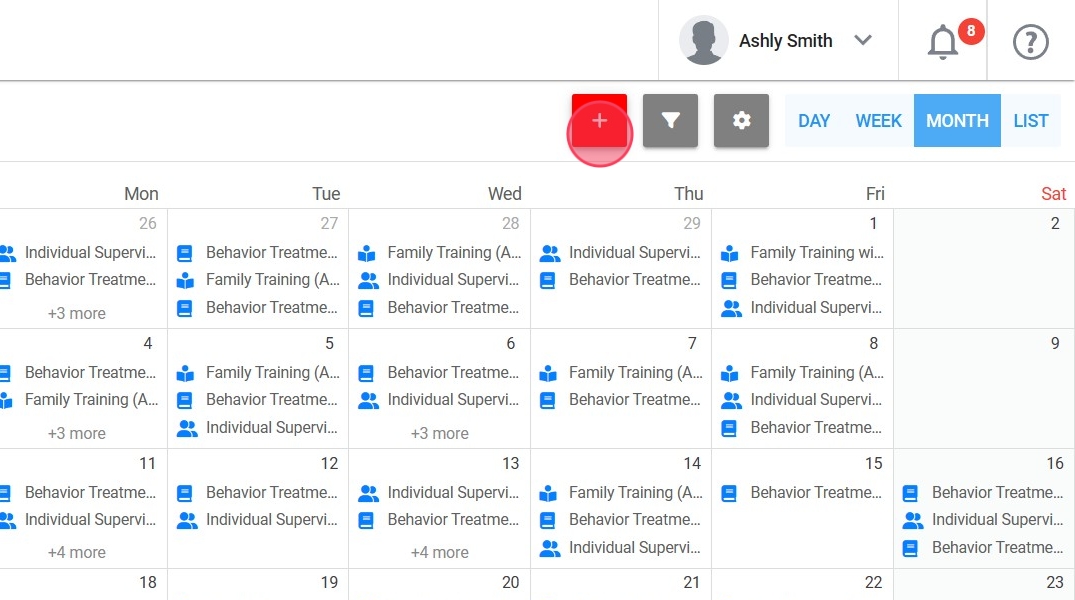 2. Primero debe crear una sesión de Family Training. Para esto, haga clic en el botón "+" situado a la derecha, en la parte superior del calendario.