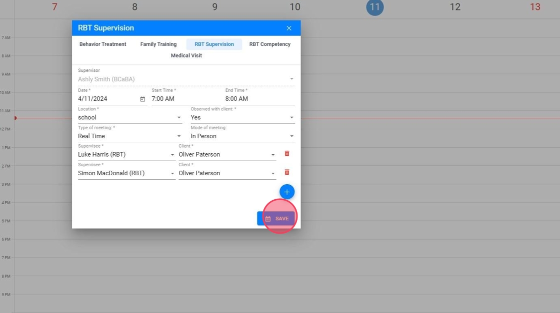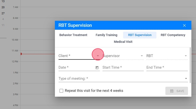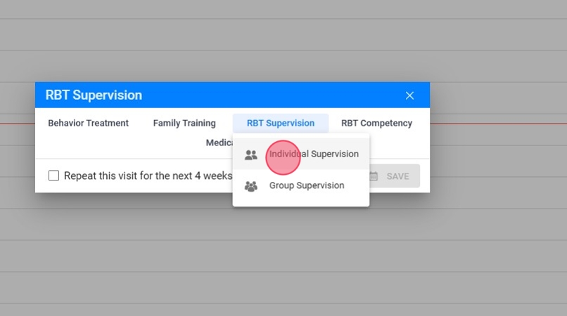 8. Haga clic en el botón "+" ubicado en la esquina superior derecha de la pantalla. Elija "RBT Supervisión" como el tipo de evento que desea programar. Seleccione "Group Supervision".