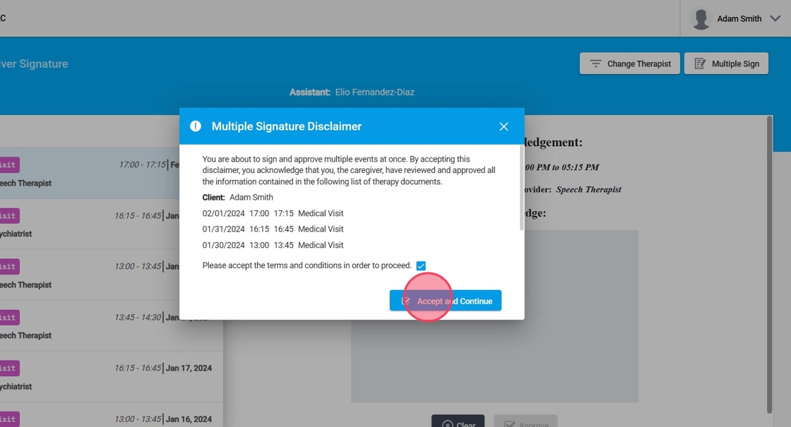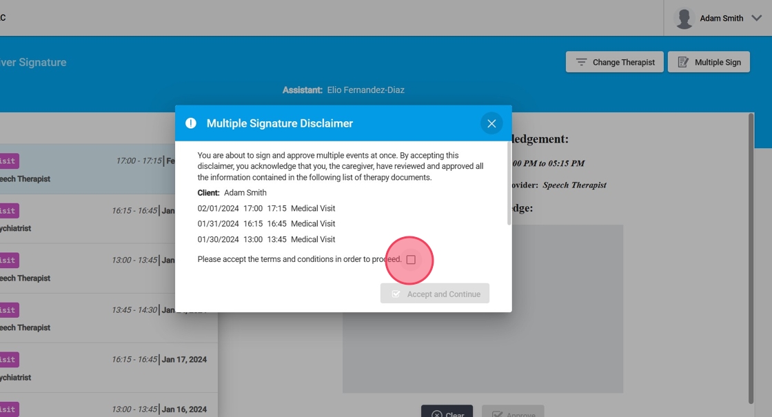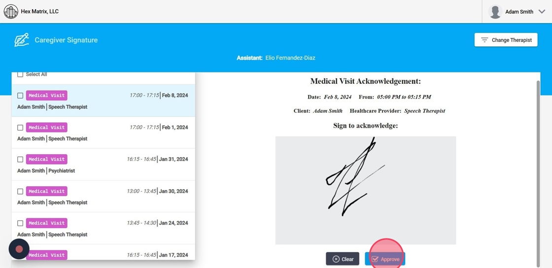 2. Una vez usted acceda al programa podrá ver el nombre del terapeuta seleccionado, así como todos los eventos listos para ser firmados.