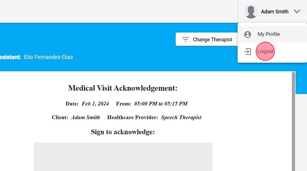 17. Se desplegará un menú desde el que podrá acceder a su perfil. Clic "Logout"