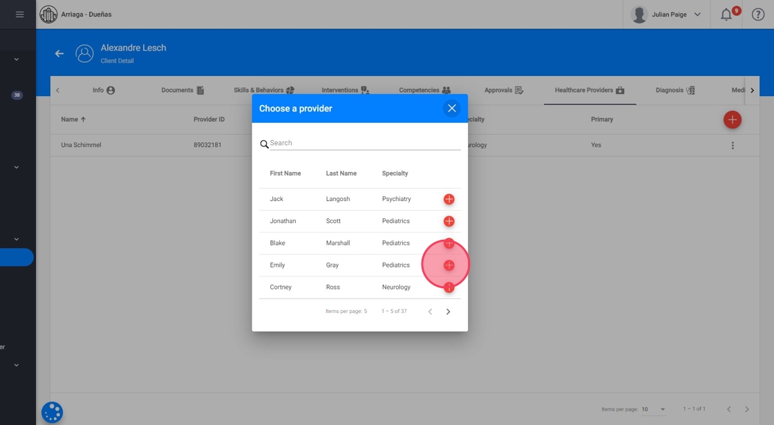 2. Desde la lista, selecciona el proveedor de servicios de salud deseado y haz clic en Add. También puedes utilizar la barra de búsqueda para localizar al proveedor: