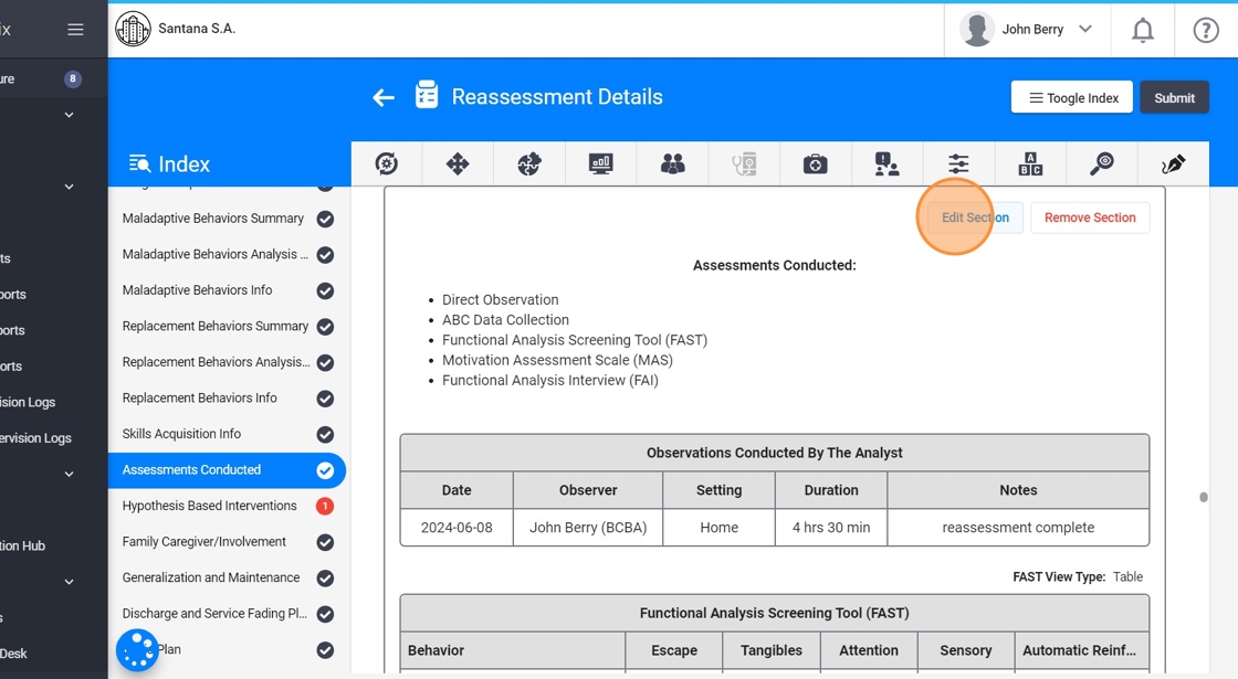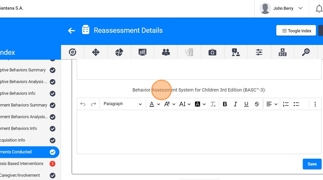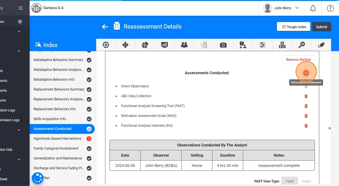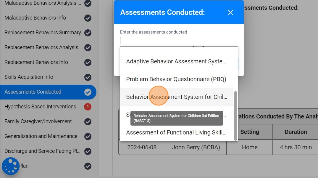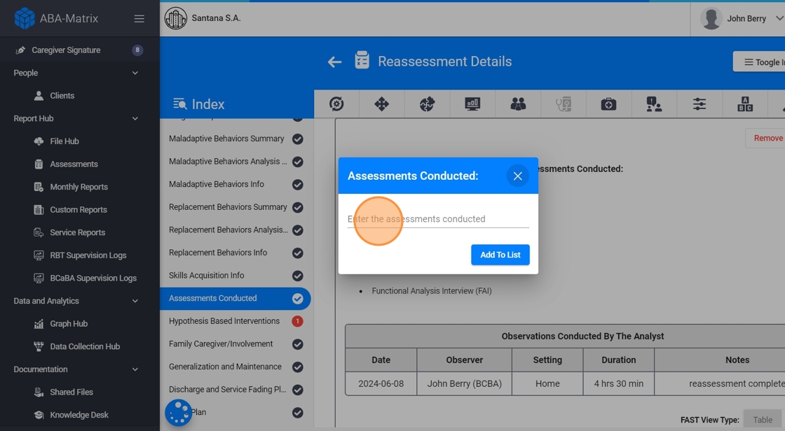 En ABA Matrix, agregar la sección "Assessment Conducted" a su informe de evaluación le permite documentar sistemáticamente varias herramientas y metodologías de evaluación utilizadas. Siga estos pasos para agregar esta sección y comprender los campos disponibles.