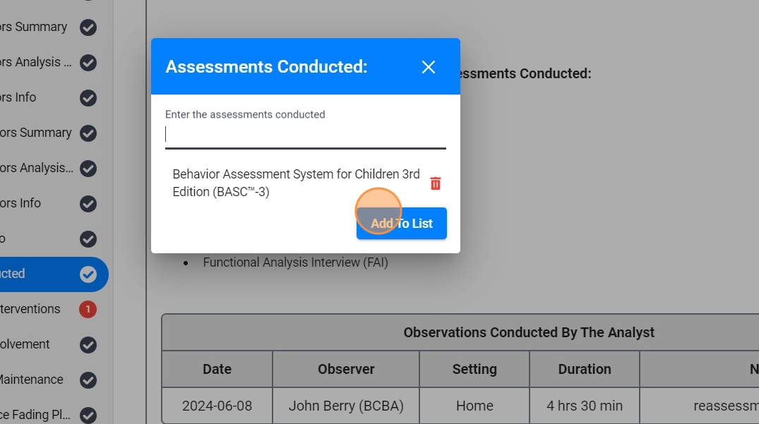 Esta guía proporciona instrucciones esenciales para agregar la sección "Assessment Conducted" a su informe de evaluación o reevaluación en ABA Matrix, lo que permite una documentación completa de varias herramientas y metodologías de evaluación. Siguiendo los pasos descritos, los usuarios pueden incluir sistemáticamente evaluaciones importantes, como la herramienta Functional Analysis Screening Tool and the Behavior Assessment System for Children.