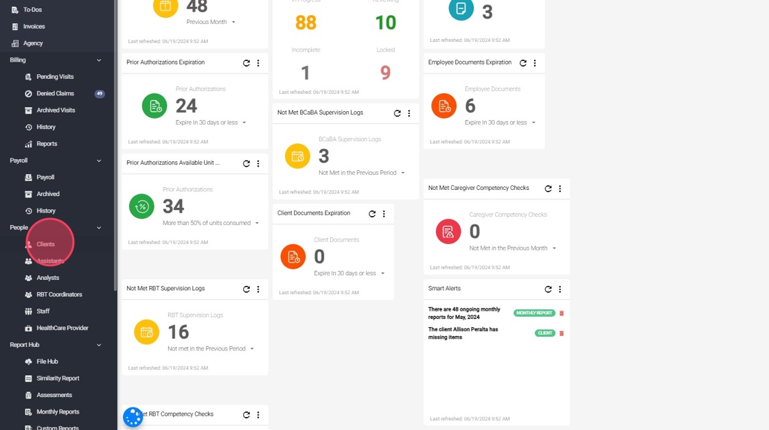 1. Log in to the program with your username and password as usual. Once inside the program, go to the "Clients" section in the side menu on the left side of your screen. Please see the following image.