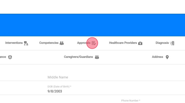 3. You will find all the documentation and information about the client. Go to the menu bar at the top of the screen and press the "Approvals" button, as shown in the image.