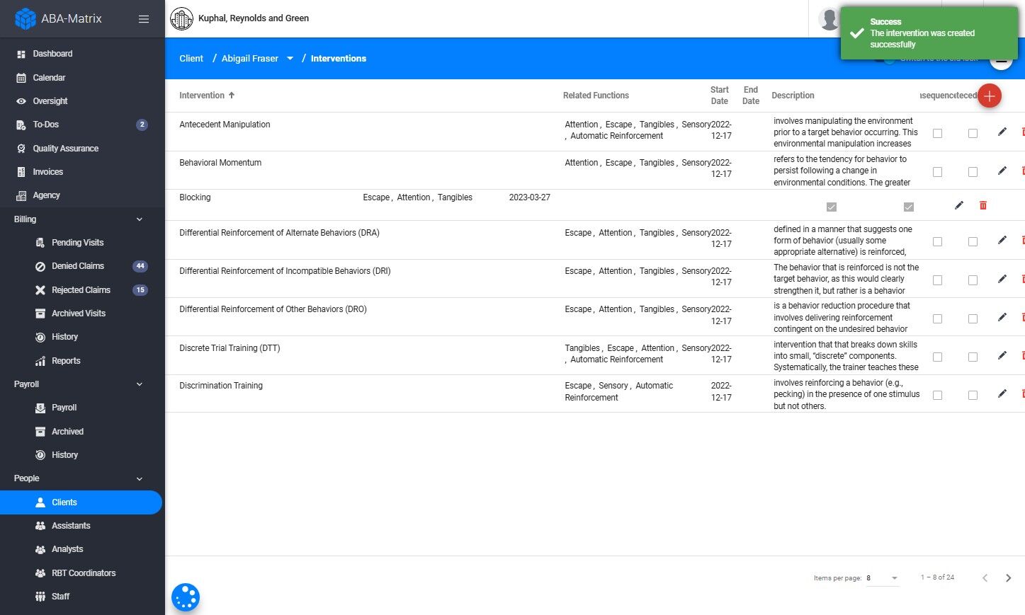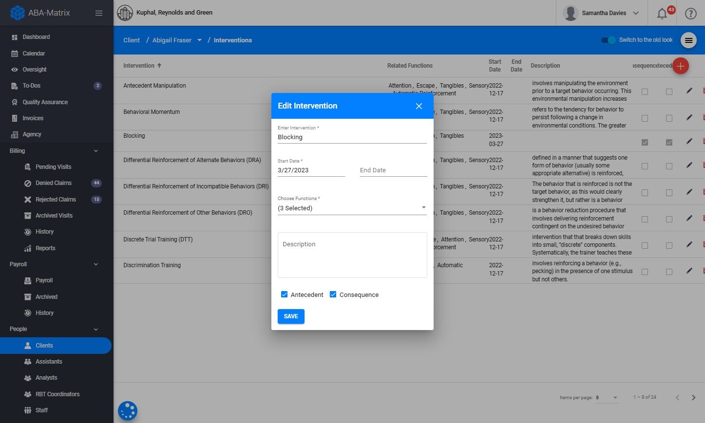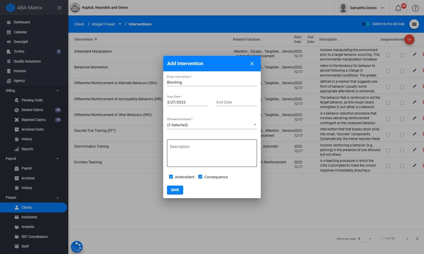 Después de agregar las intervenciones al perfil del cliente, puedes vincularlas a una conducta específica. De este modo, cuando el RBT complete su nota y seleccione una conducta, solo se mostrarán como disponibles las intervenciones de antecedente o consecuencia que estén vinculadas a esa conducta.