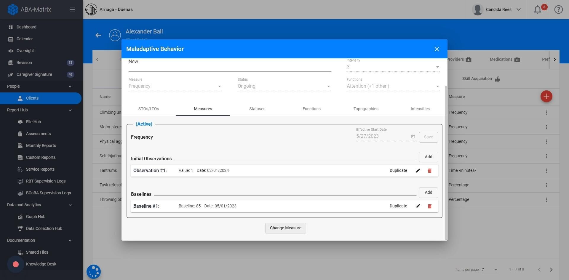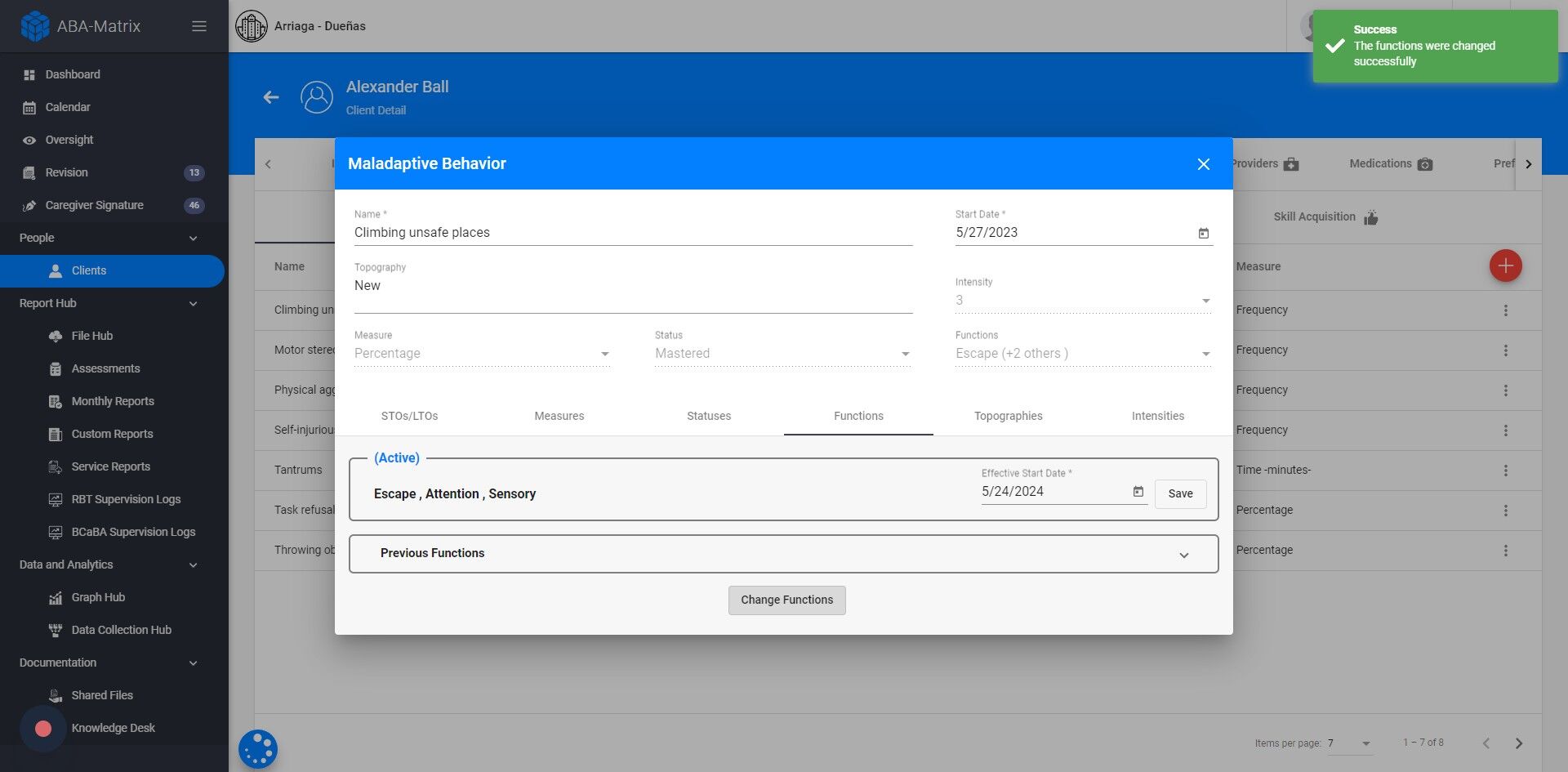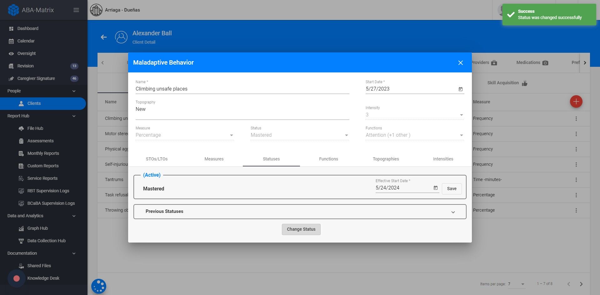 This guide provides step-by-step instructions on how to change measures, status, functions, or topography in an existing maladaptive behavior. It is applicable not only to maladaptive behaviors but also to replacement behaviors, skill acquisitions, caregiver goals, and RBT goals. The guide includes clear instructions and images to help users easily navigate the process.