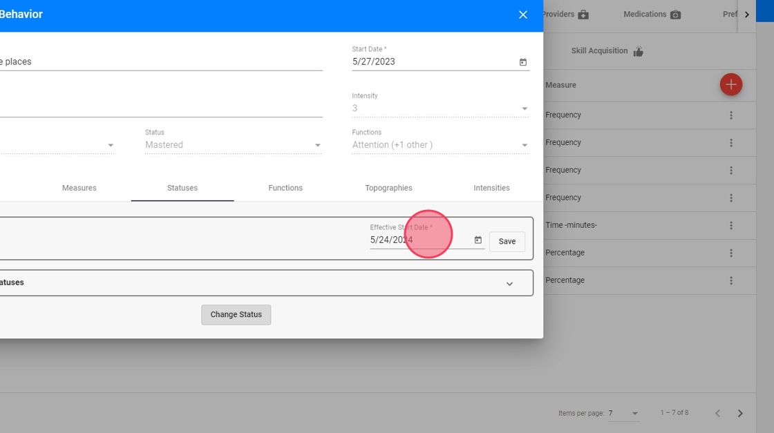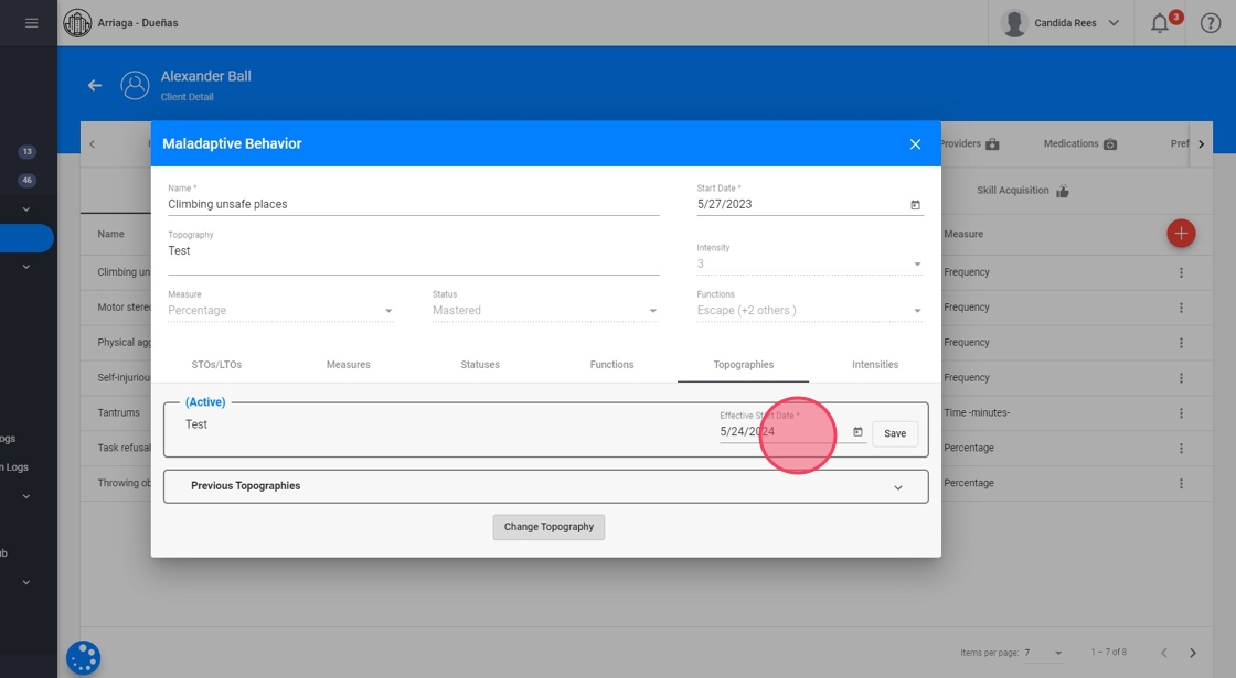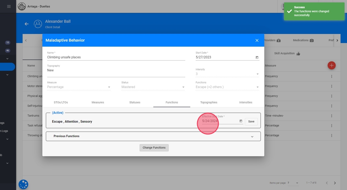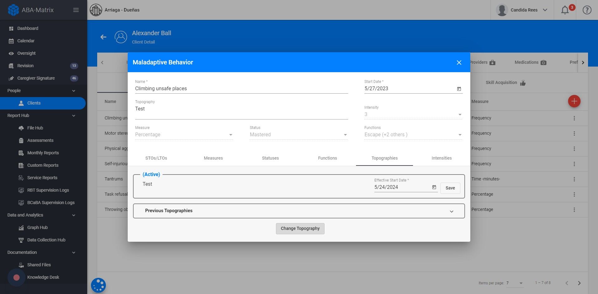 This guide provides step-by-step instructions on how to change measures, status, functions, or topography in an existing maladaptive behavior. It is applicable not only to maladaptive behaviors but also to replacement behaviors, skill acquisitions, caregiver goals, and RBT goals. The guide includes clear instructions and images to help users easily navigate the process.