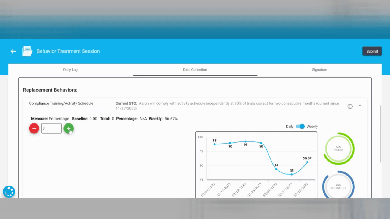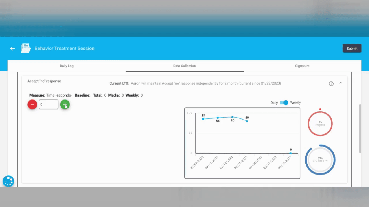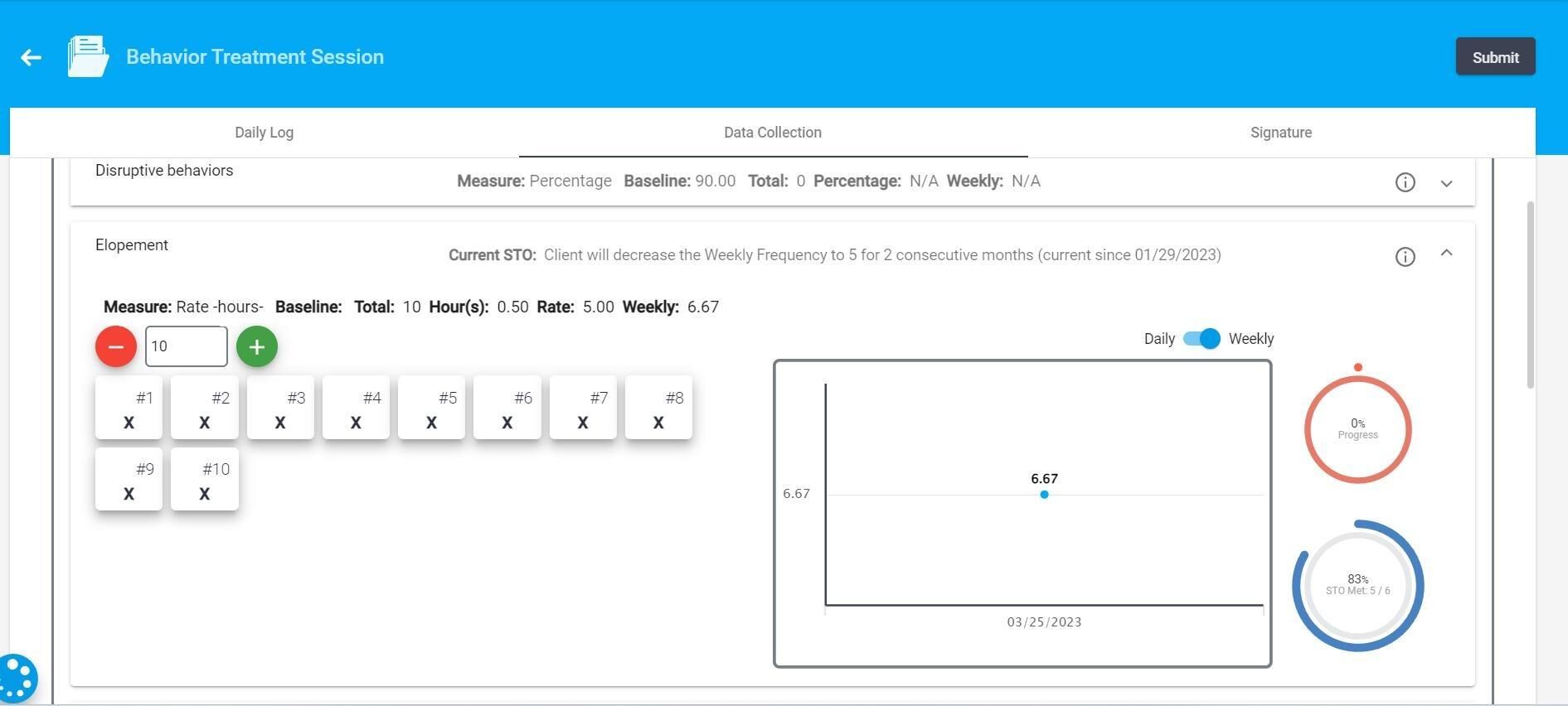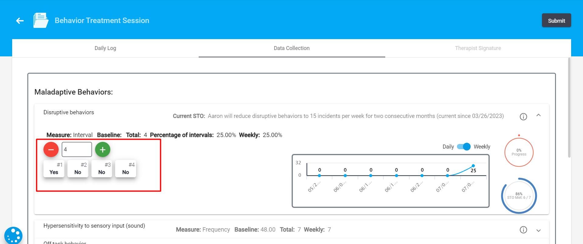- Discontinued: Behaviors labeled as "Discontinued" are no longer being targeted or addressed. They do not require data collection and are not displayed in the session notes.