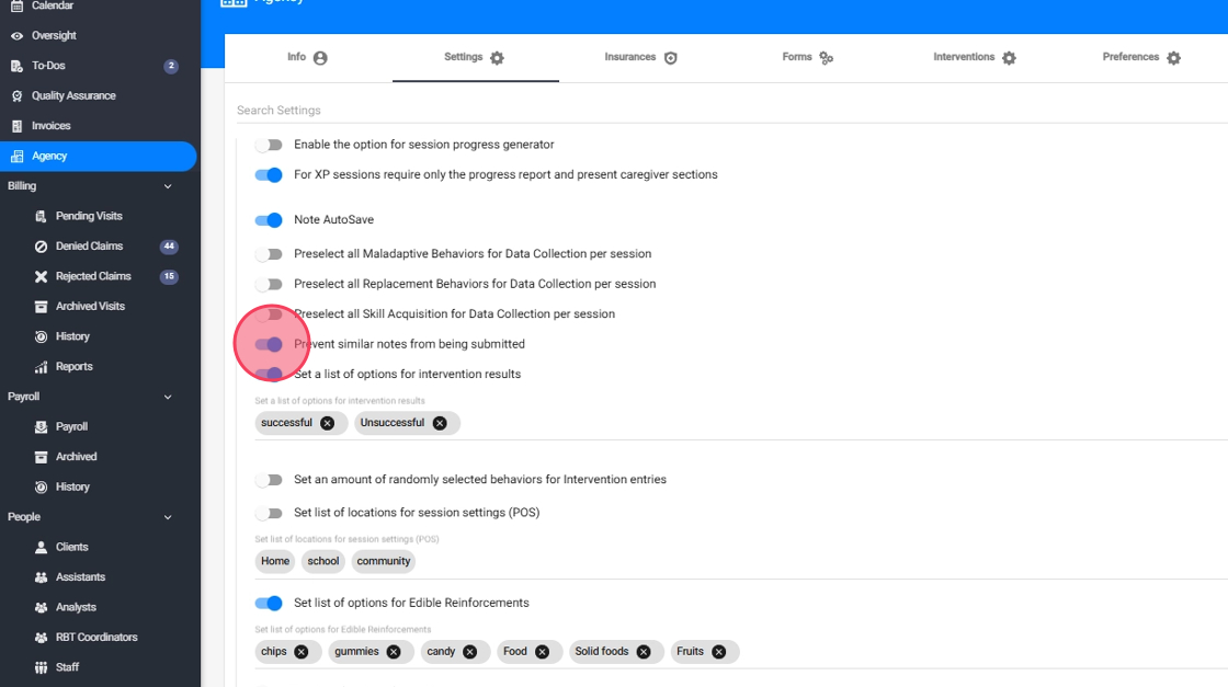 3. If you enable this setting, every time therapists attempt to submit the note the system will automatically check for similarity according to the percentage threshold. If the session note fails to meet the similarity criteria set by the agency, the system will prevent the therapist from submitting the note until the issues are addressed and the note passes the similarity check. This setting helps agencies maintain quality control and ensures that all session notes meet agency-specific standards for uniqueness.