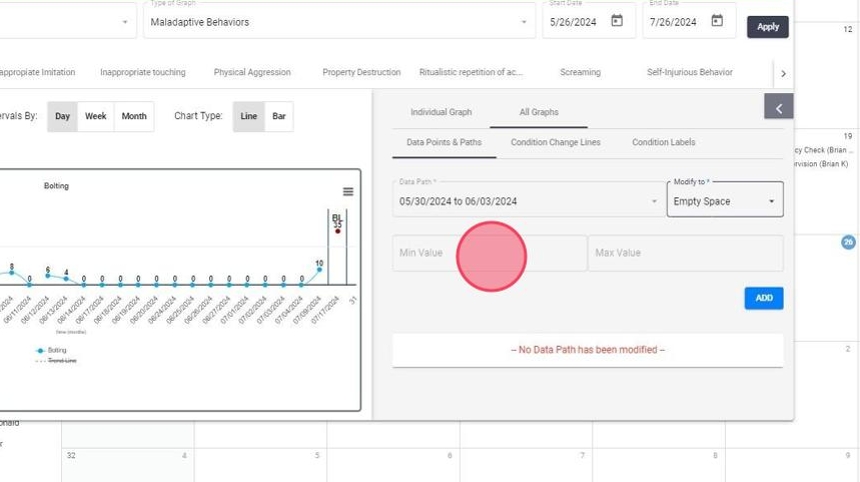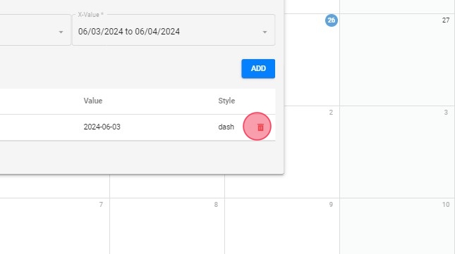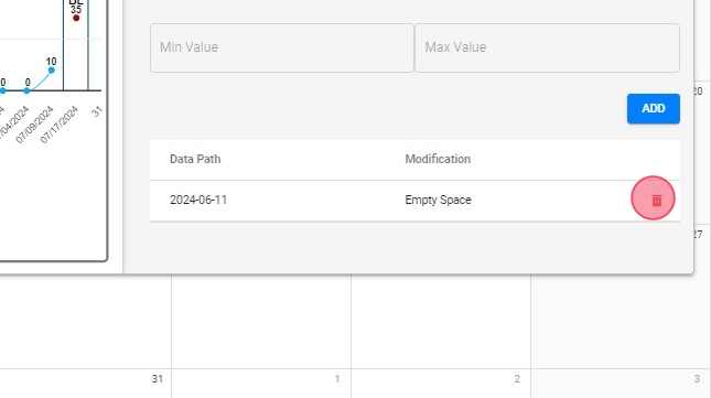 28. Una vez que hayas completado los campos necesarios, presiona el botón "Add", como se muestra en la imagen. Notarás que en el gráfico de la izquierda habrá una interrupción en la línea continua de datos en la fecha deseada.