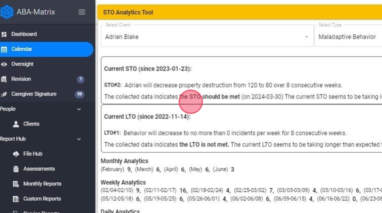 La herramienta STO Analytics en ABA Matrix está diseñada para ayudarlo a analizar los datos recopilados y realizar un seguimiento efectivo del progreso de sus clientes. Siga estos pasos para utilizar la herramienta.