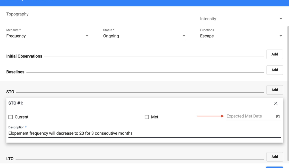 - Ejemplo de redacción correcta de STO para que la IA en el sistema reconozca la medición de frecuencia: "Adrian will decrease physical aggression from 150 to 114 over 8 consecutive weeks."
