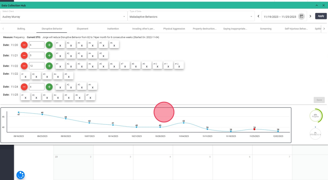 2. Solo tienes que filtrar por el cliente que deseas, el tipo de gráfico (Maladaptive Behaviors, Replacement Behaviors or Skill Acquisitions) y fecha: