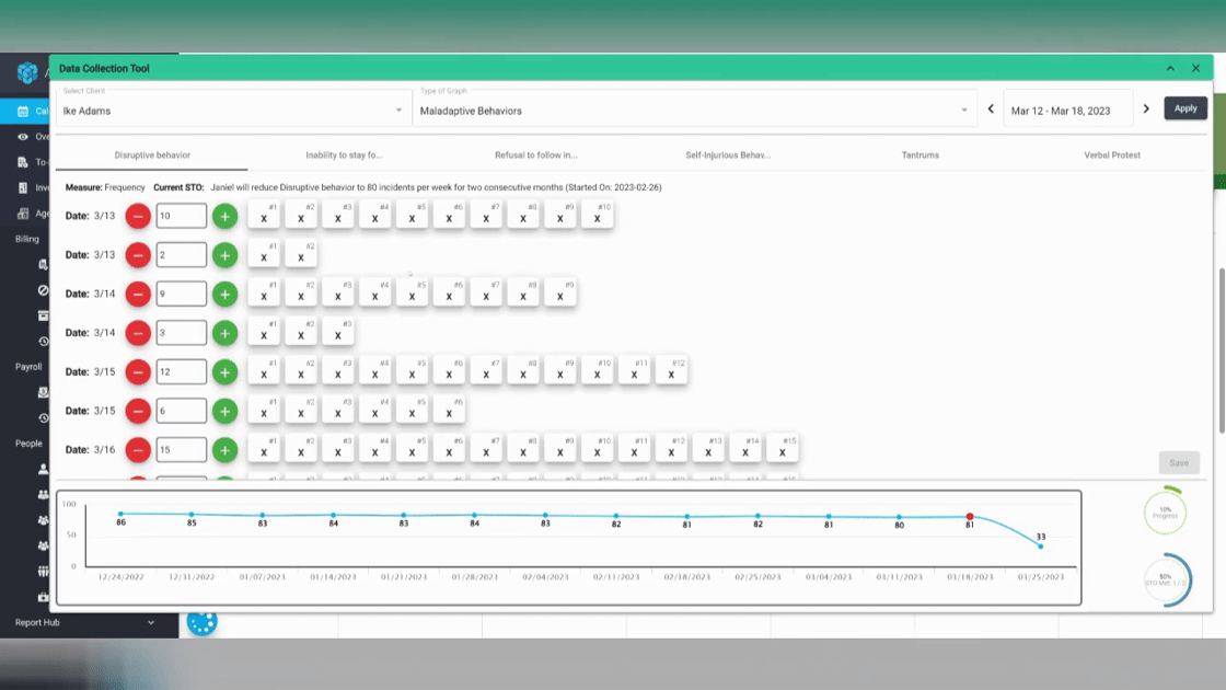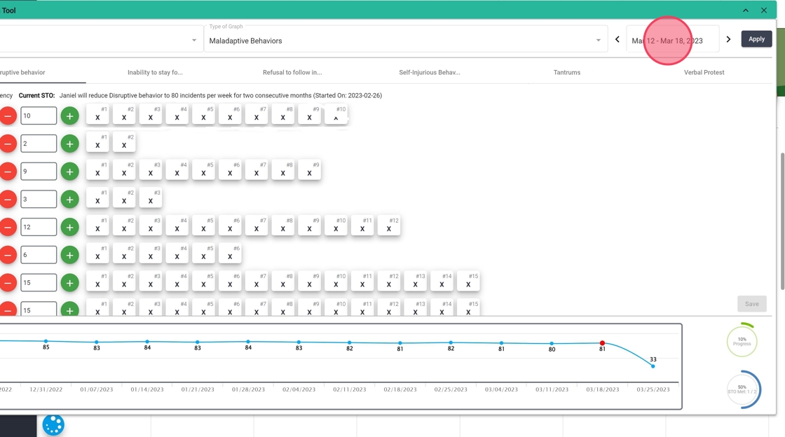 2. Solo tiene que filtrar por el cliente que desea, el tipo de gráfico (Maladaptive Behaviors, Replacement Behaviors o Skill Acquisitions) y la fecha: