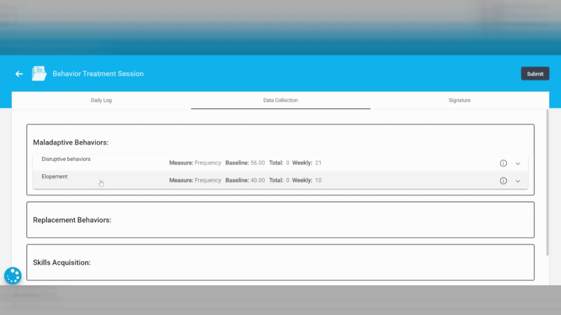 3. Desde la pestaña de Registro Diario (Daily Log), debe localizar la sección Target Behaviors, Replacements and Skills Observed.