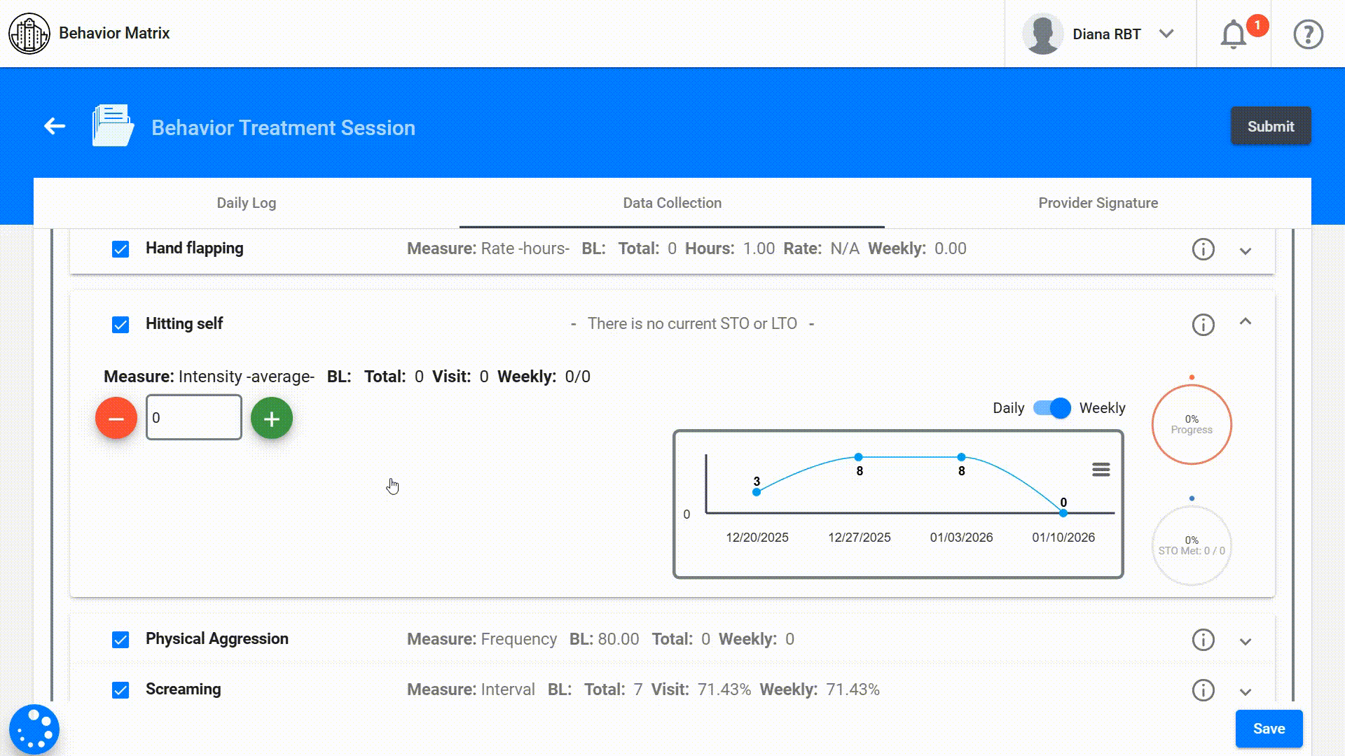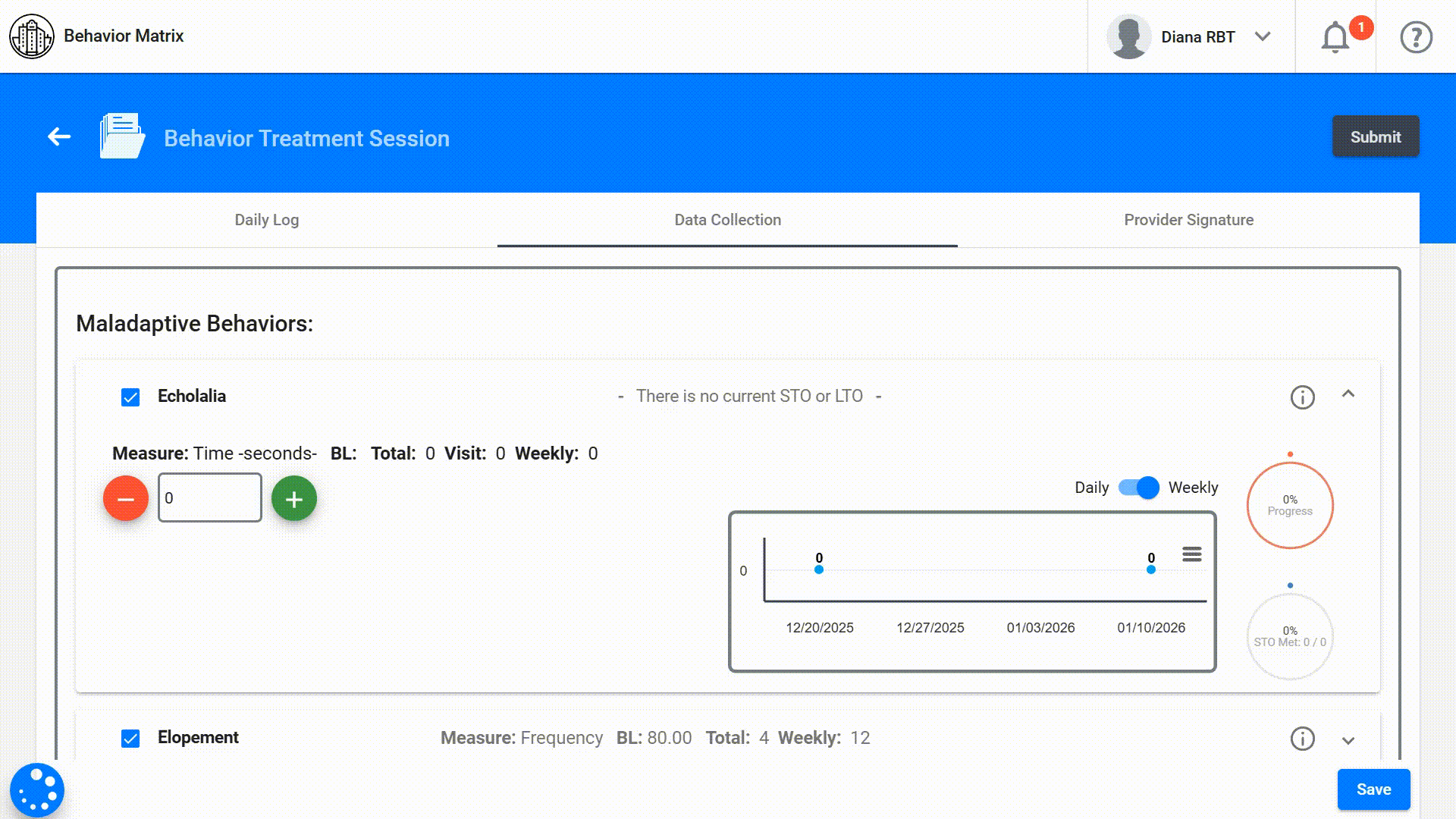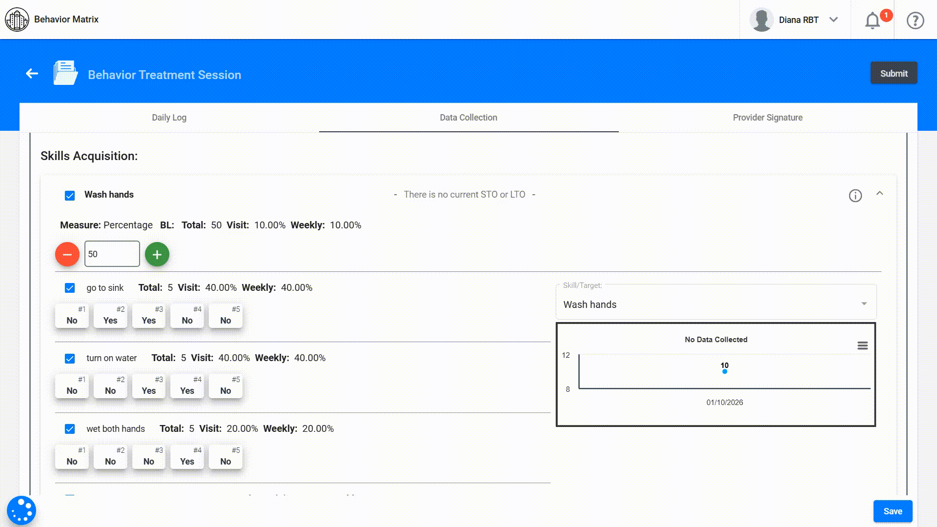 5. Si decide marcar una conducta, un reemplazo o una habilidad para la recolección de datos, pero no ingresa ningún dato para ello, el sistema registrará automáticamente un valor de 0 para esa sesión.