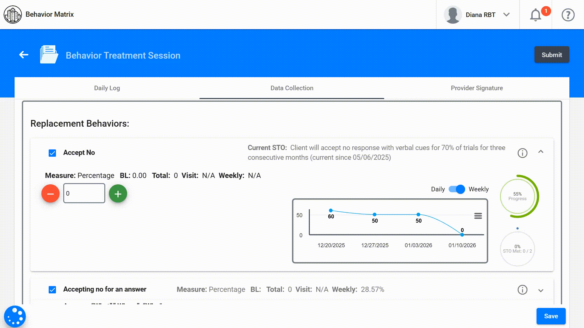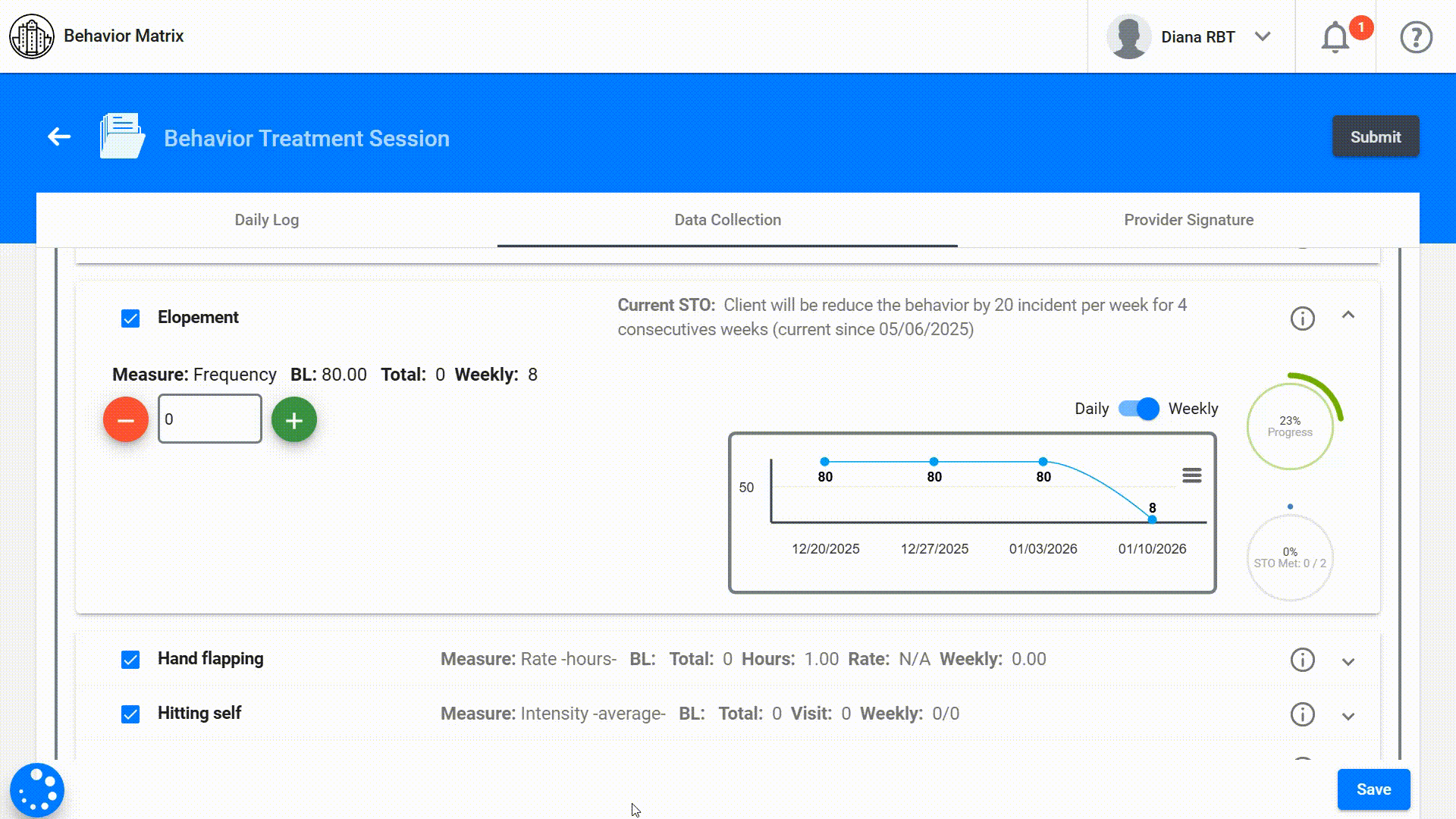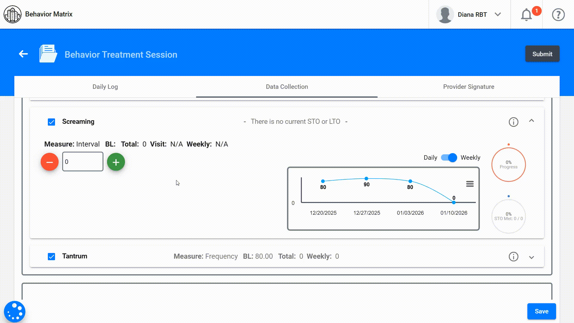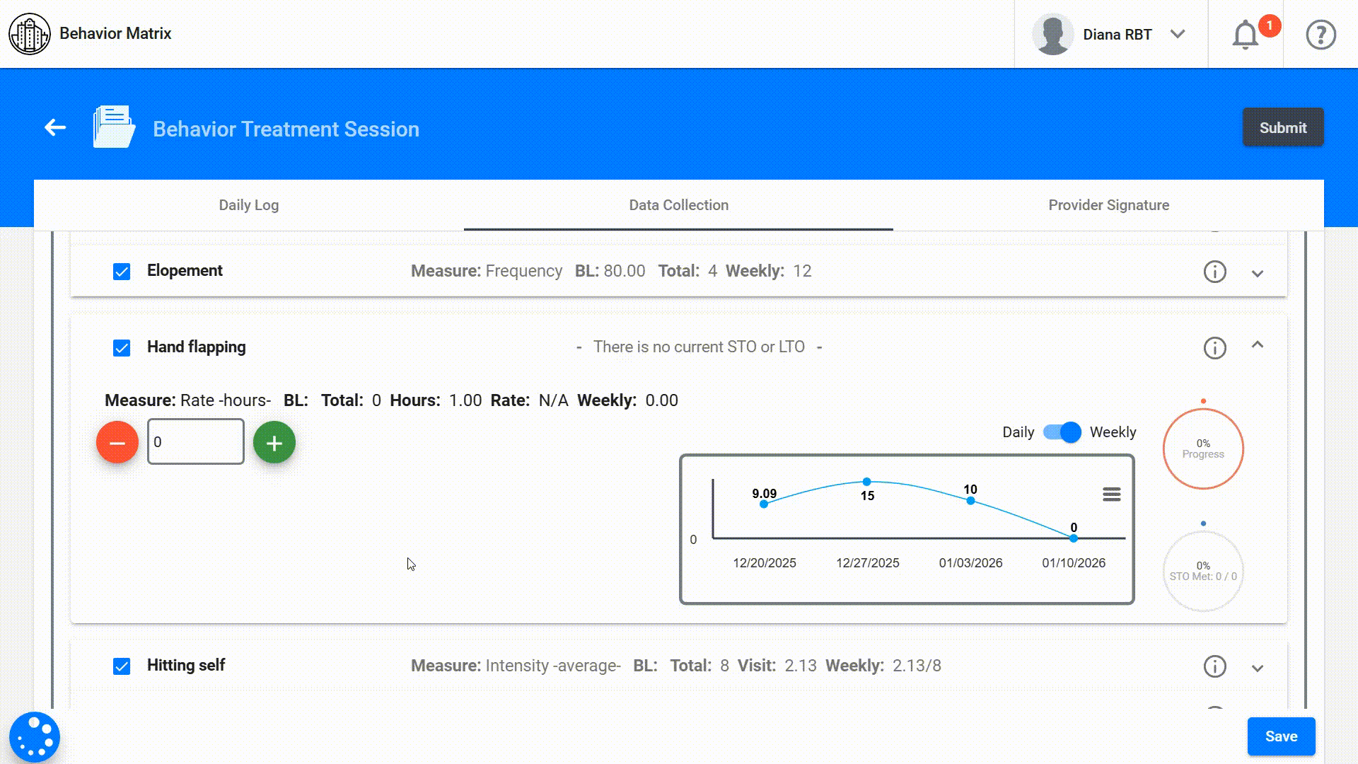 5. Si decide marcar una conducta, un reemplazo o una habilidad para la recolección de datos, pero no ingresa ningún dato para ello, el sistema registrará automáticamente un valor de 0 para esa sesión.