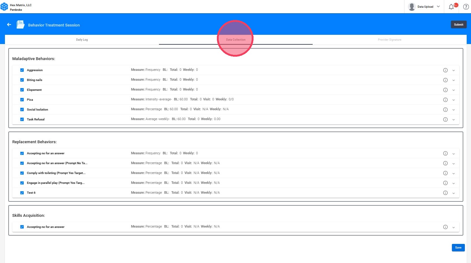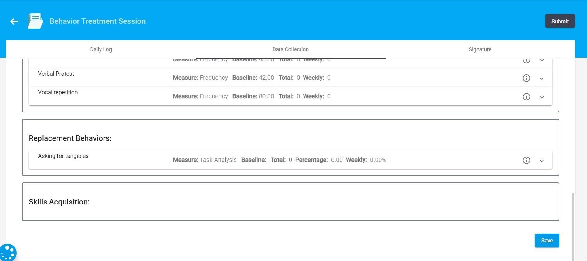 5. If you choose to mark a behavior, replacement, or skill for data collection but do not input any data for it, the system will automatically record a value of 0 for that session.