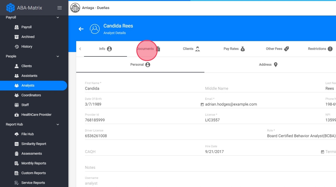 Los documentos de los asistentes, analistas y miembros del personal (por ejemplo, HIPPA, seguridad, antecedentes policiales, así como la licencia de asistente y analista) se pueden archivar dentro de la ventana "Documentos" que se encuentra en el perfil de cada empleado.