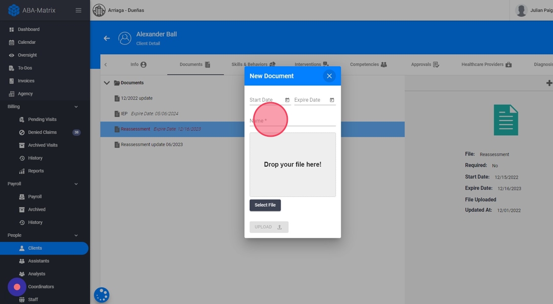 7. En la parte central de la pantalla encontrarás toda la documentación en el programa sobre el cliente; simplemente busca el documento que deseas actualizar. Una vez seleccionado el documento, aparecerá información sobre la fecha de inicio y la última actualización en el lateral, como se puede ver en la imagen: