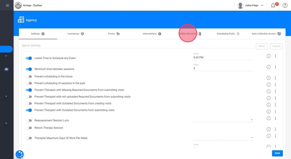 5. As a Staff, you can configure settings that govern the behavior of the agency. One of these settings, under the Agency Settings > Scheduling section, is "Prevent Therapist with Missing Required Documents from submitting visits".