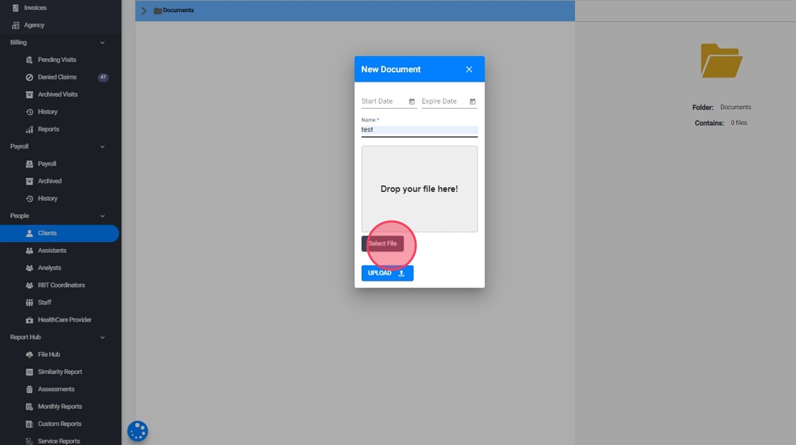 7. Once the fields are complete, press the "Select File" button to search your computer for the desired document. This will allow you to upload the document into the program.