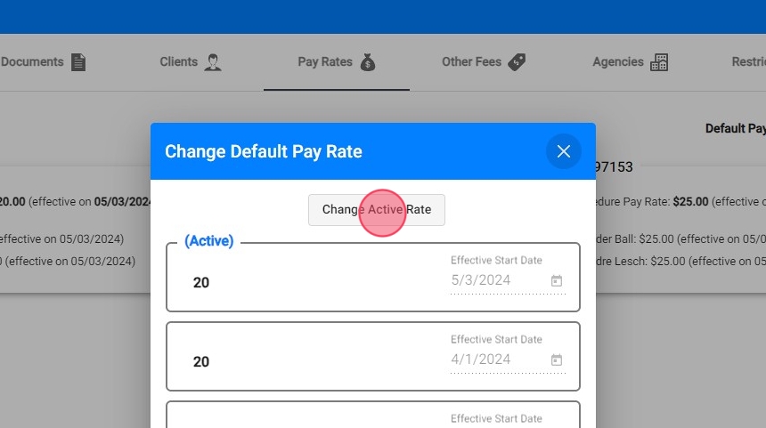 Puede ajustar las tarifas de pago de sus empleados, incluida la tarifa predeterminada y cualquier tarifa asignada por procedimiento o cliente. También puede establecer una fecha de vigencia, de modo que las notas pendientes utilizarán la tasa anterior hasta que la nueva tasa entre en vigencia en la fecha especificada.