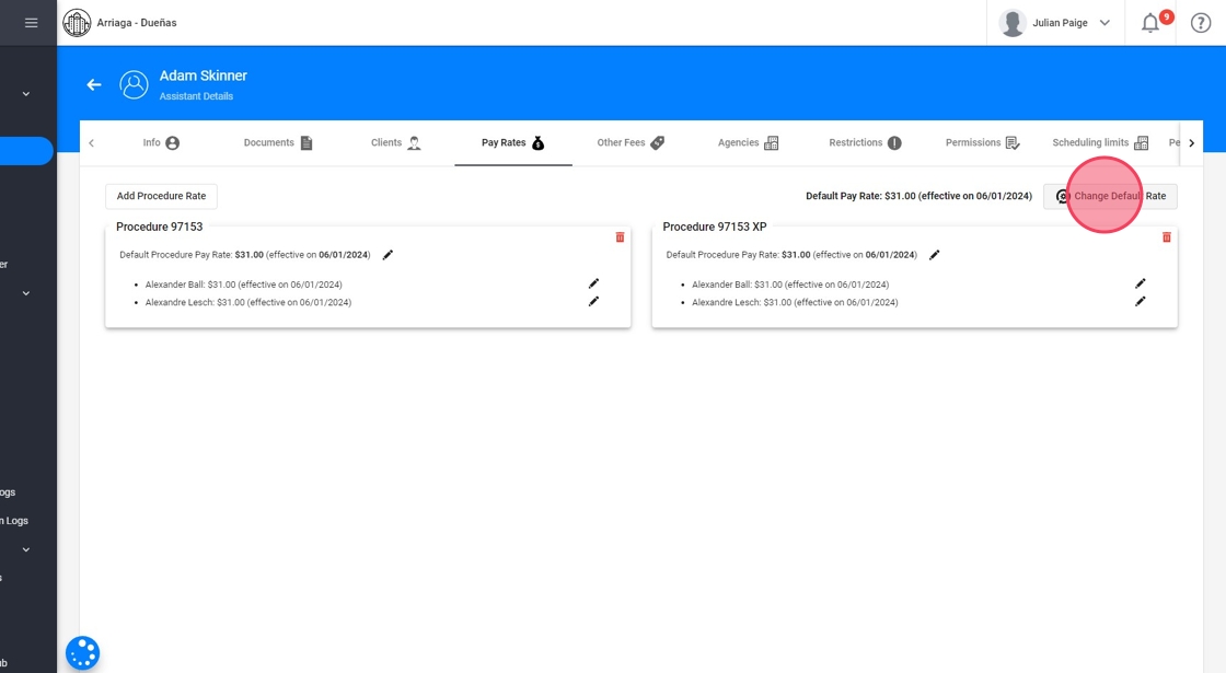 1. Para cambiar la tarifa predeterminada, acceda al perfil del empleado y seleccione la pestaña "Pay Rates".