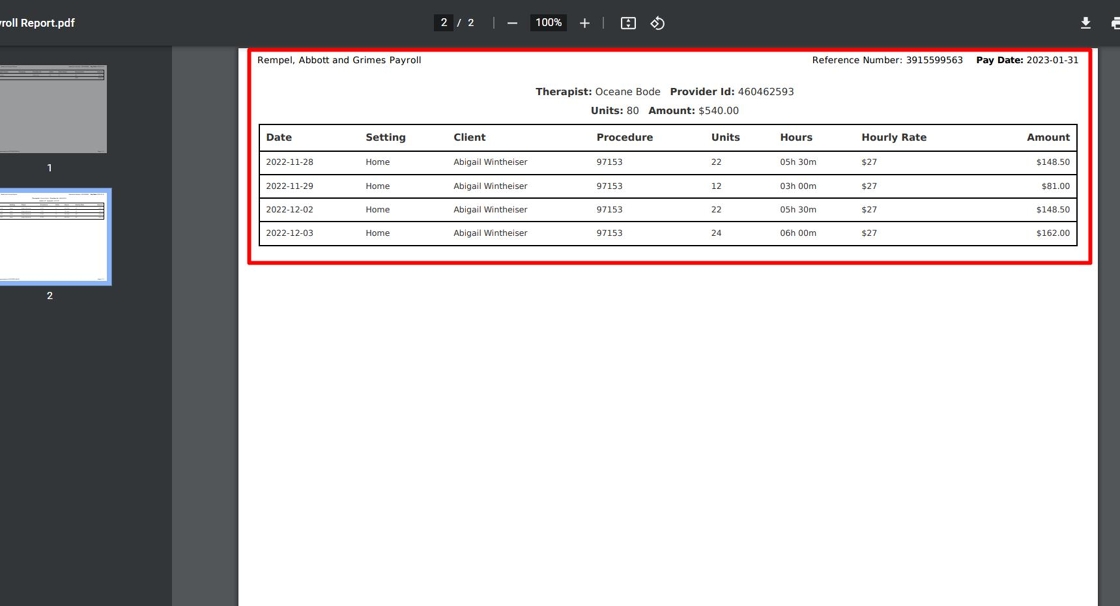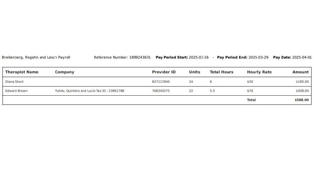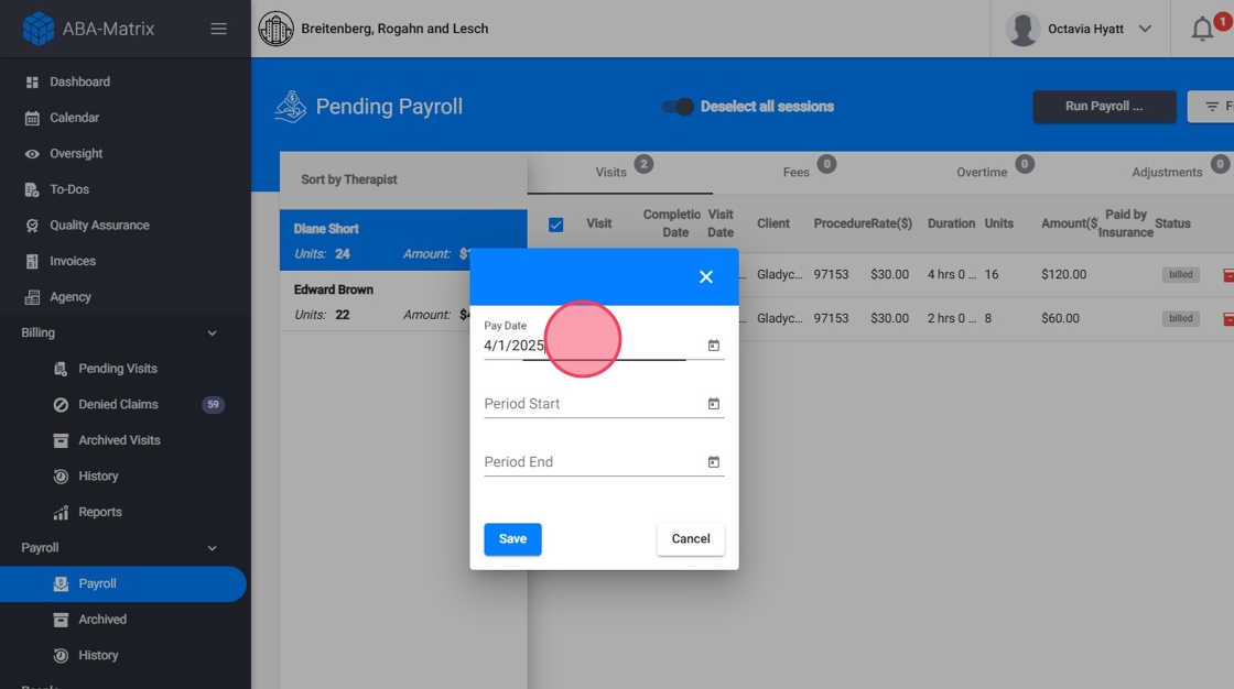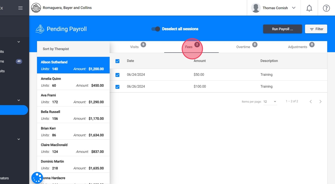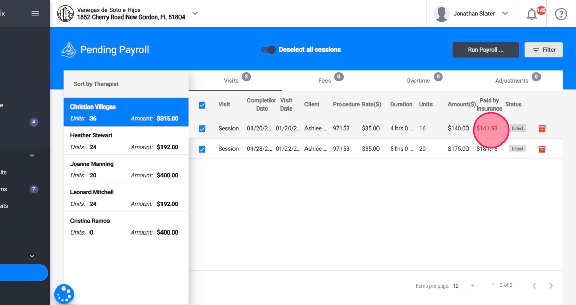 Todas las sesiones programadas en el sistema que cumplan con las condiciones de nómina estarán disponibles para su procesamiento. El sistema utiliza la tarifa establecida para cada terapeuta (por código y cliente) para calcular cuánto se les debe por cada sesión.