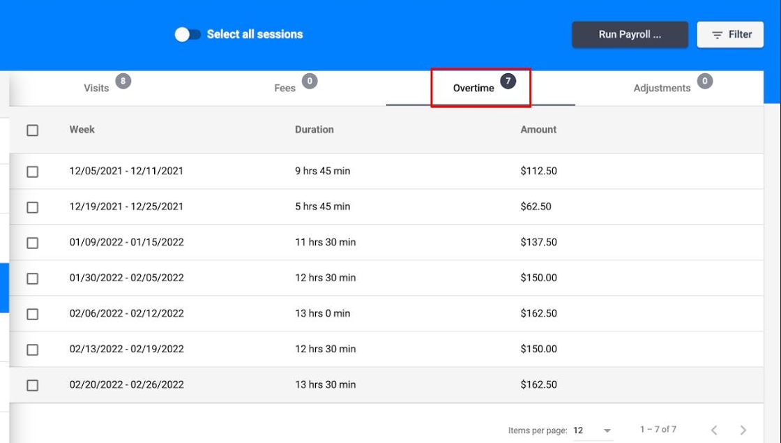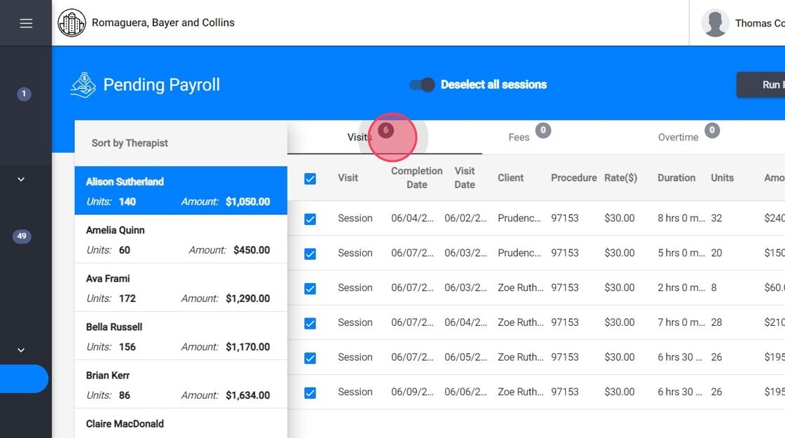 2. Por defecto, todas las visitas estarán marcadas para ejecutarse en el payroll. Si no desea pagar una sesión específica, solo tiene que desmarcarla. Además, tendrá la opción de desmarcar todas las sesiones: