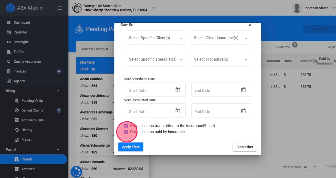 8. Puedes usar la opción de filtro para ayudarte a seleccionar las sesiones que deseas pagar. Puedes filtrar por cliente, terapeuta, seguro, procedimiento y/o fecha.